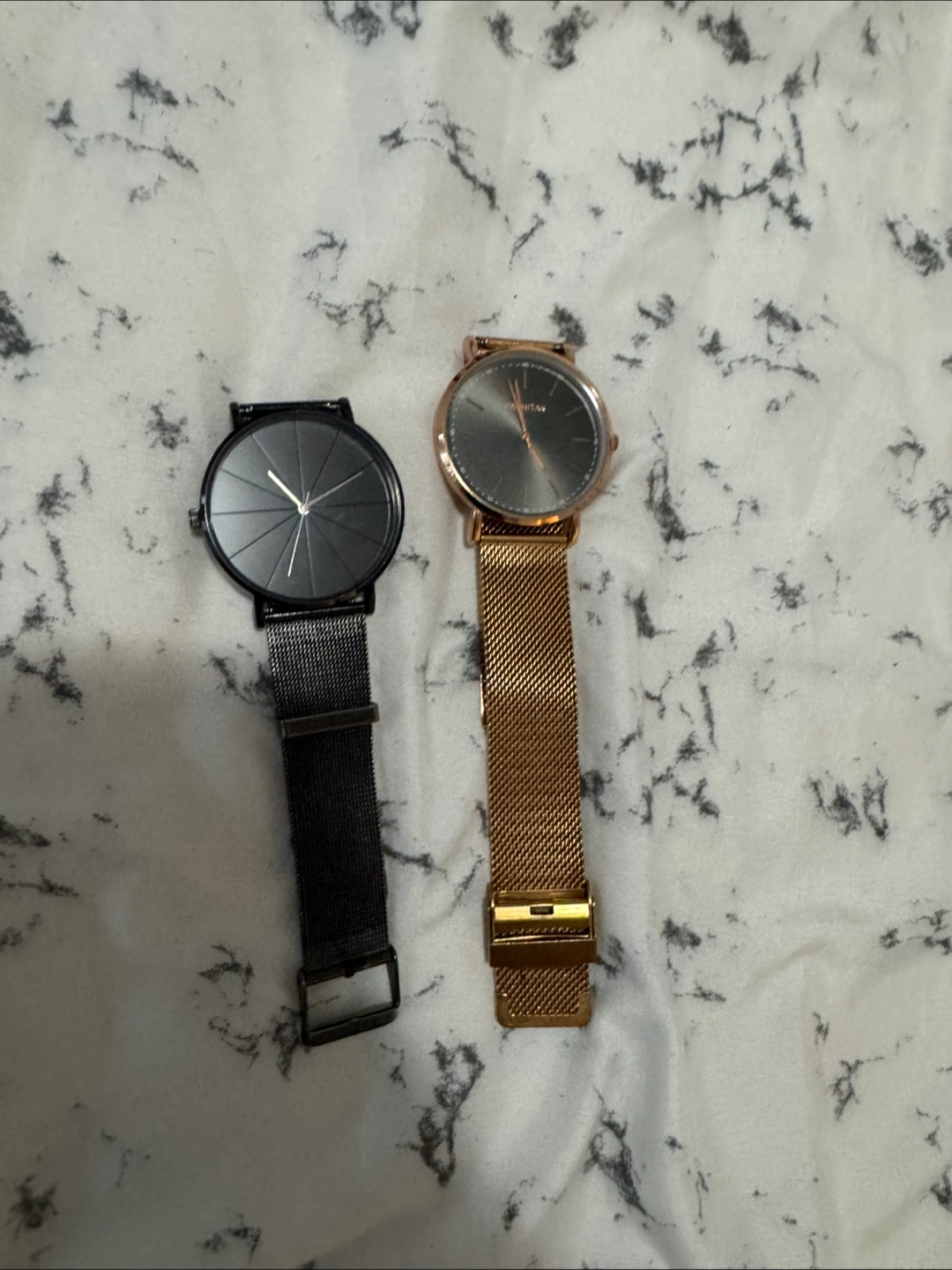 Watches with metallic mesh straps. One watch has a black watch face and strap. The other watch has a rose gold watch face and strap. A great way to keep track of time.