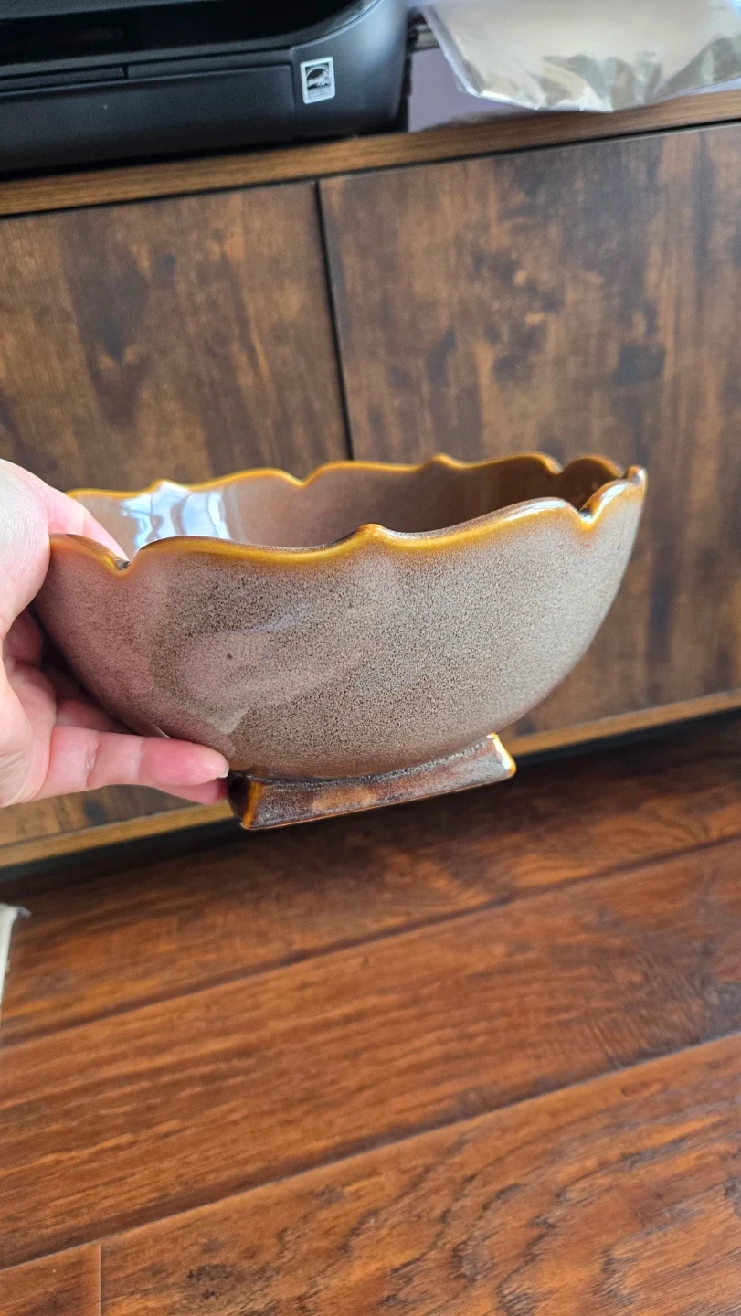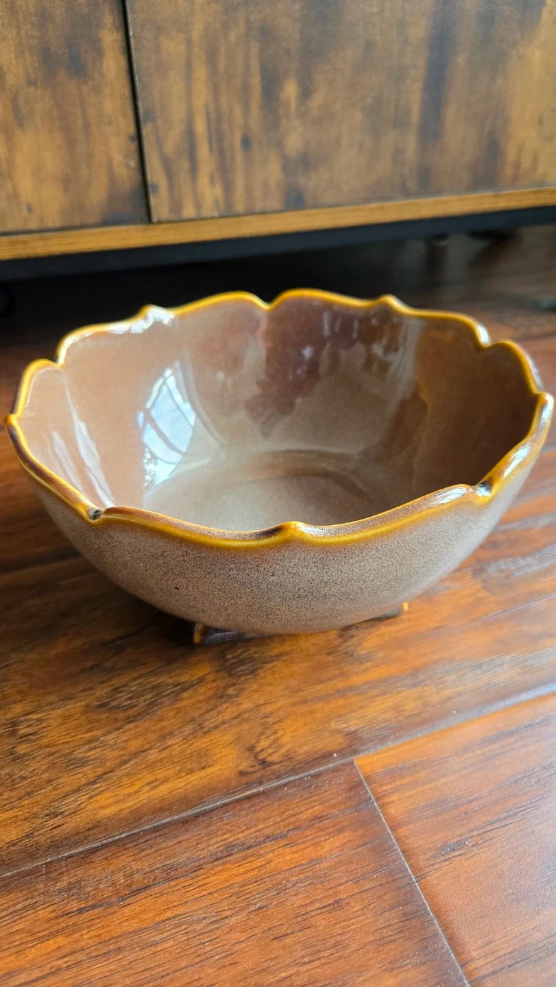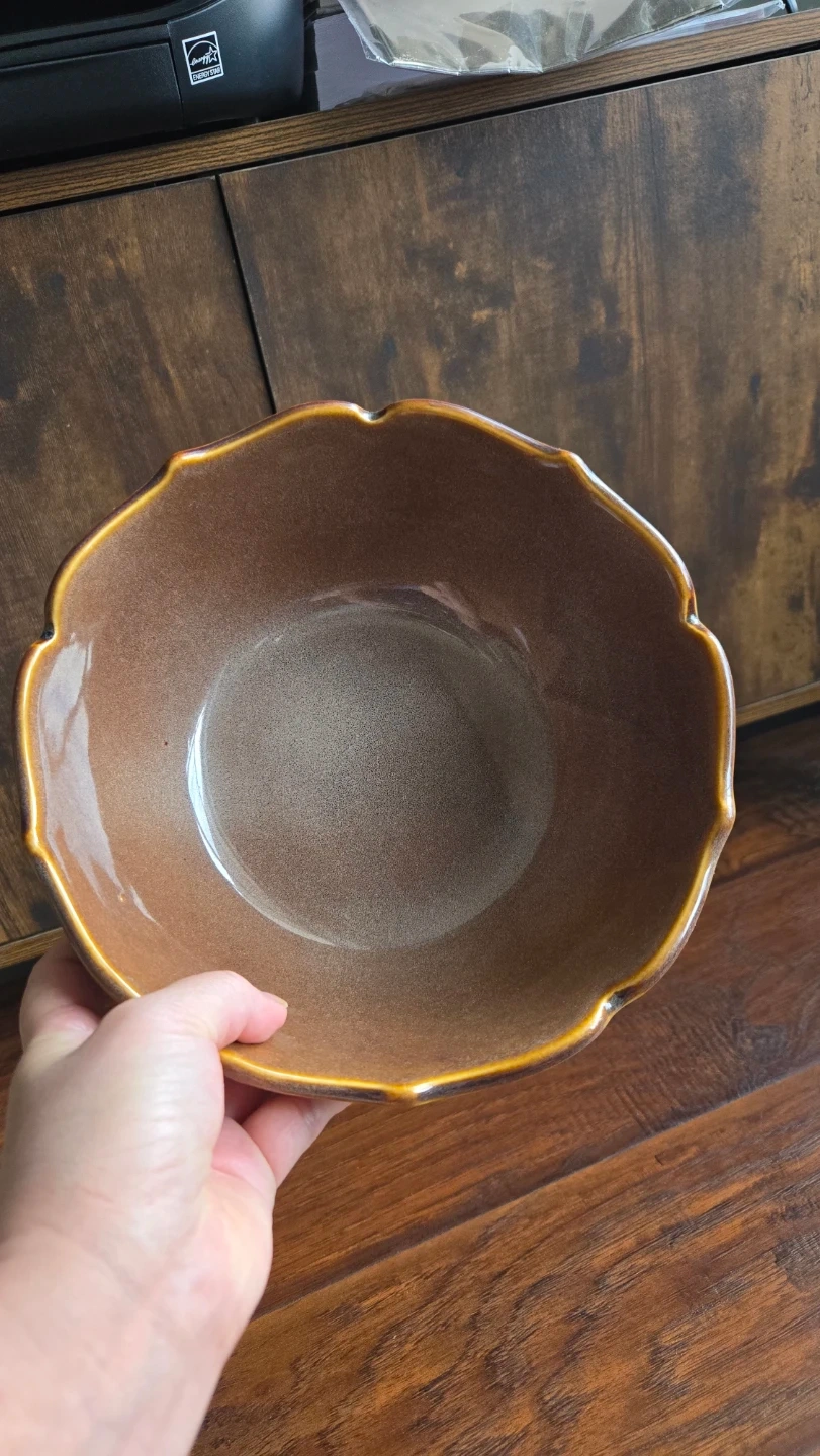 Decorative Bombay serving bowl with a scalloped rim. Brown speckled glaze finish. Made in China. You can use it as a center piece, fruit bowl, serving bowl or salad bowl...
