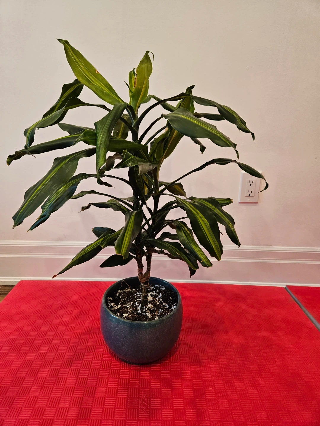 This is a potted Dracaena plant, also known as a corn plant. It's in a teal blue ceramic pot. This plant thrives in medium, indirect light and is quite forgiving if you forget to water it occasionally.