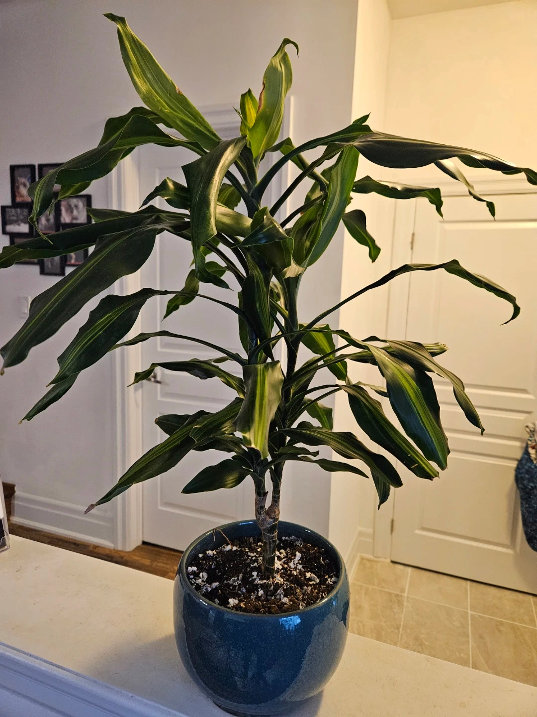 This is a potted Dracaena plant, also known as a corn plant. It's in a teal blue ceramic pot. This plant thrives in medium, indirect light and is quite forgiving if you forget to water it occasionally.