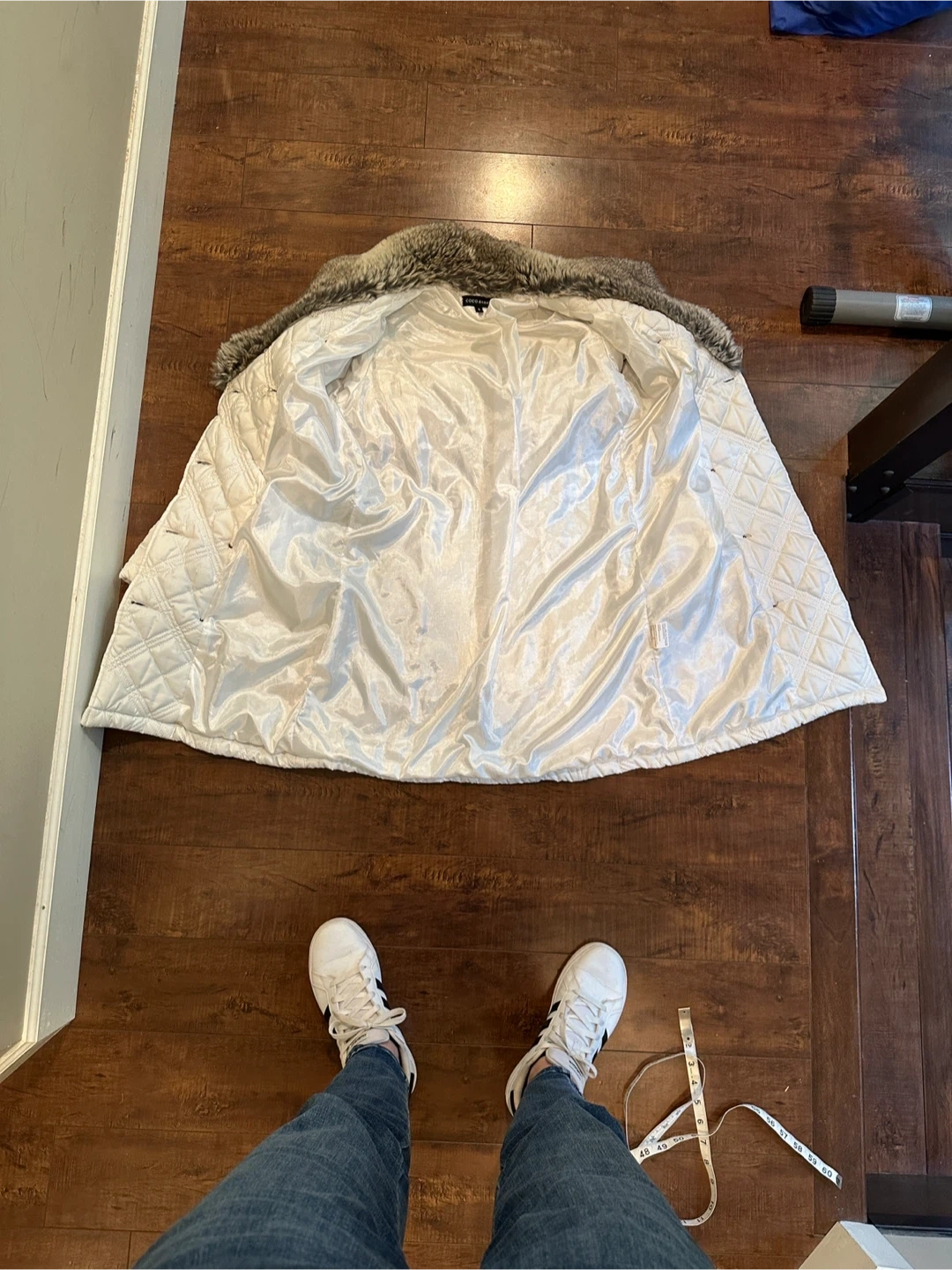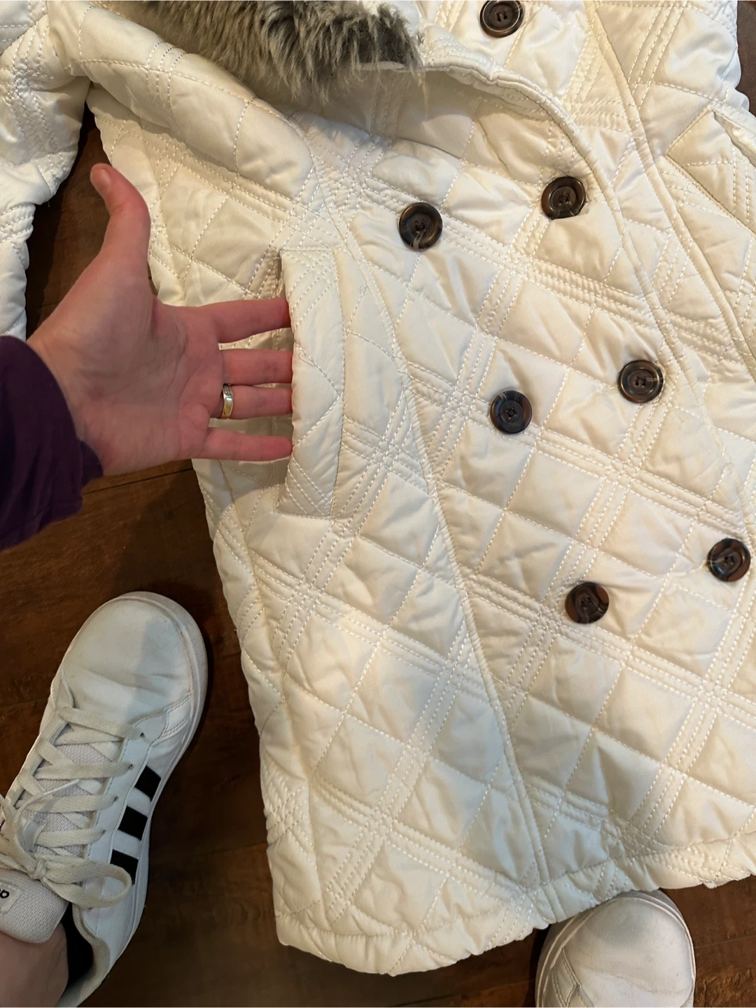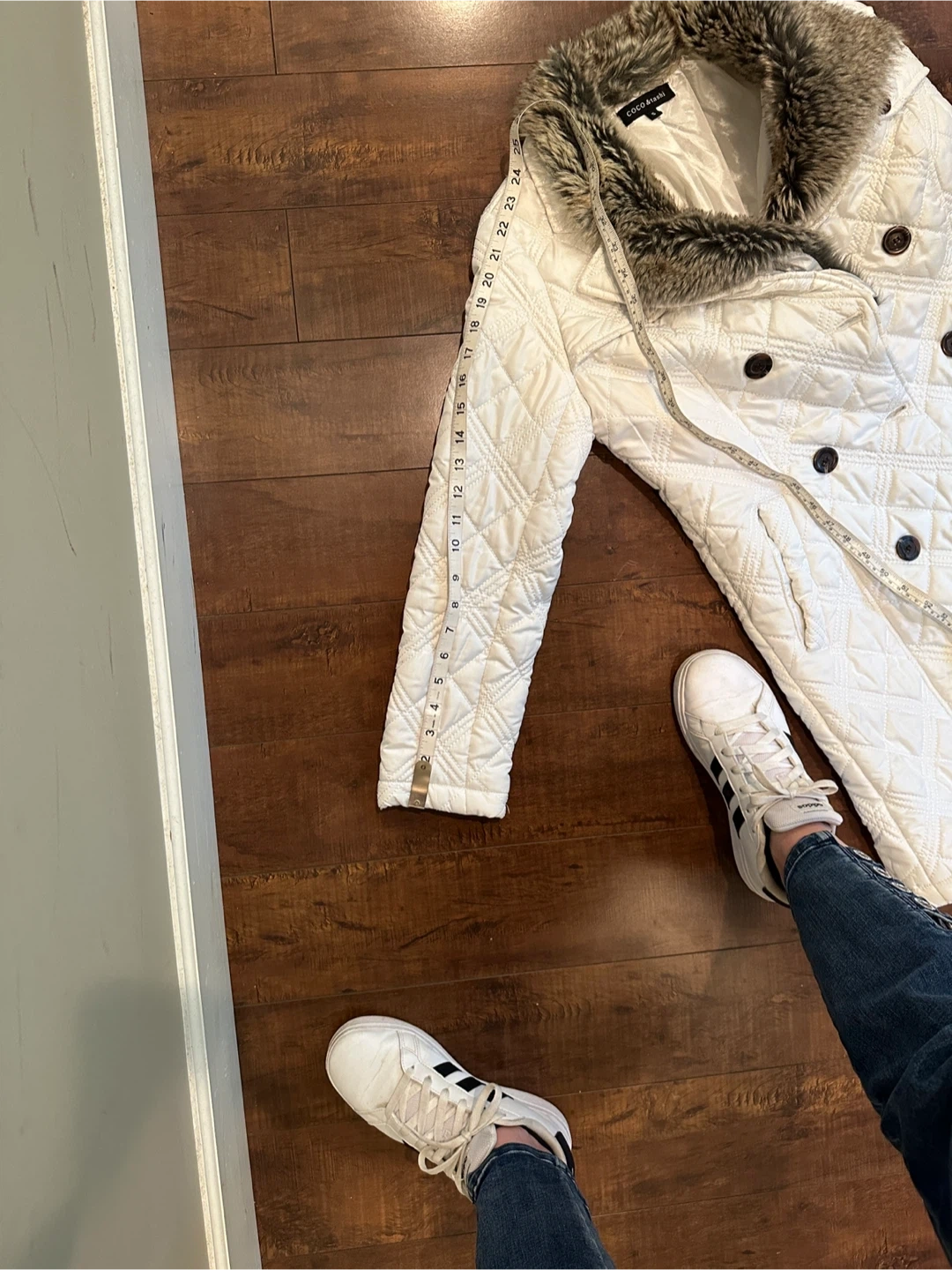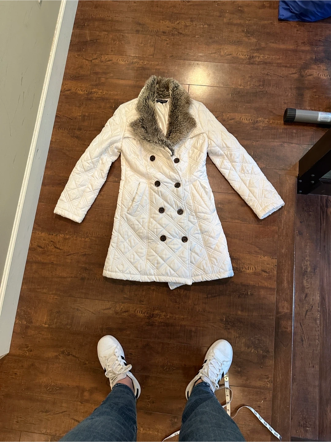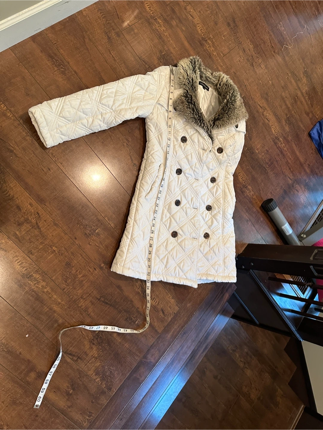Coco & Tashi chic white quilted coat size Small. Featuring a plush faux fur collar, which is removable. Pockets in the front and button up, it's designed for both warmth and style. Perfect for any occasion. Excellent Condition. All Measurements are approximate.