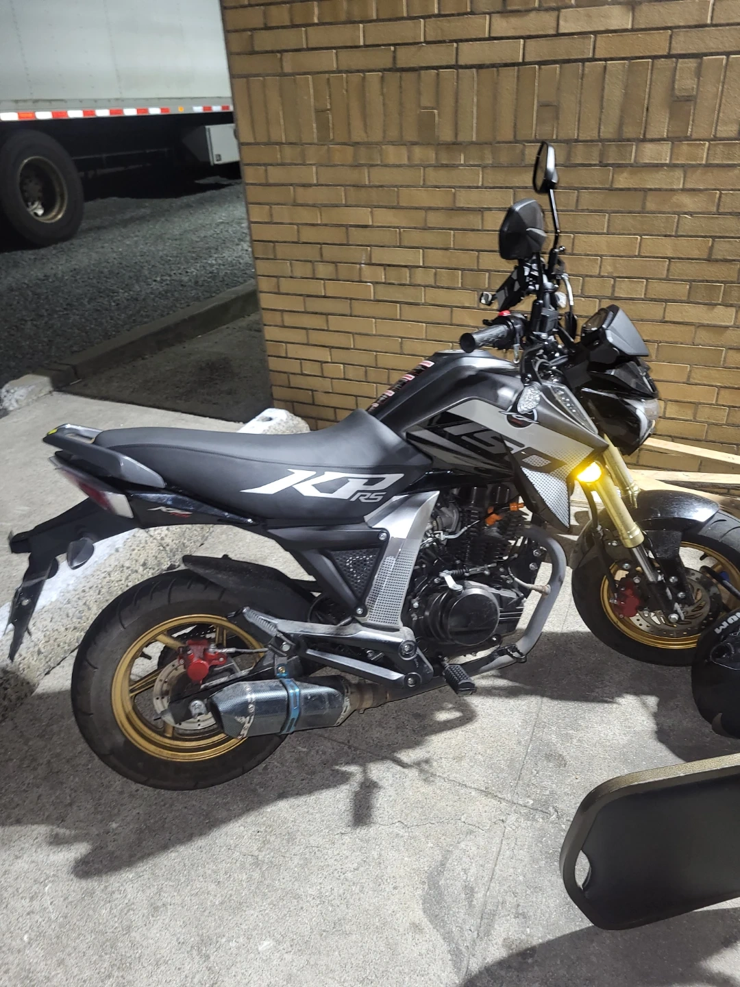 This is a used KP RS motorcycle in black and silver. It features a custom exhaust and gold rims. Perfect for zipping around town! Goes 65mph and great ride about 120 miles for the tank