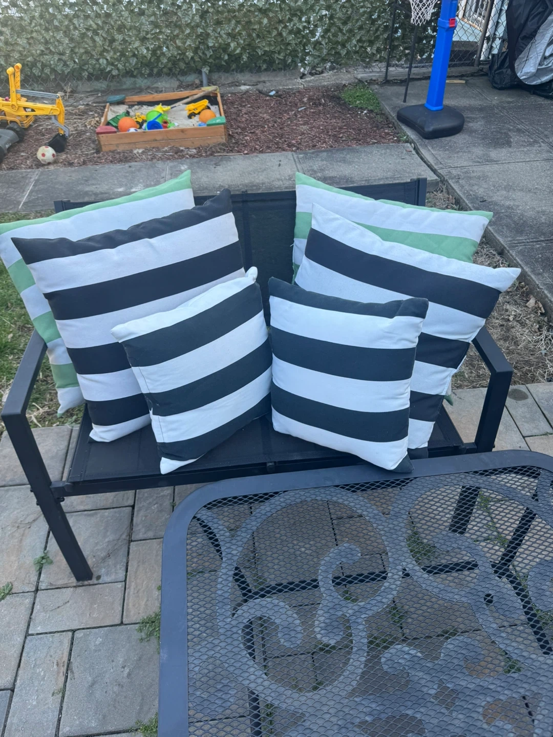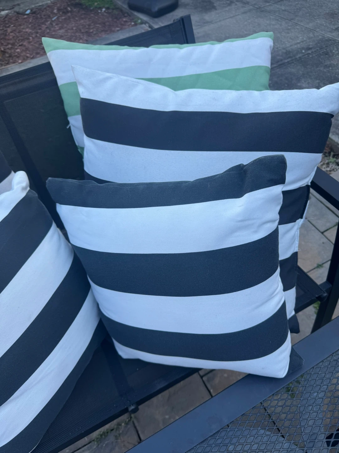 Add a pop of pattern to your outdoor seating with these five striped throw pillows. Features black, white, and light green stripes. They're perfect for enhancing the comfort and style of your patio furniture!