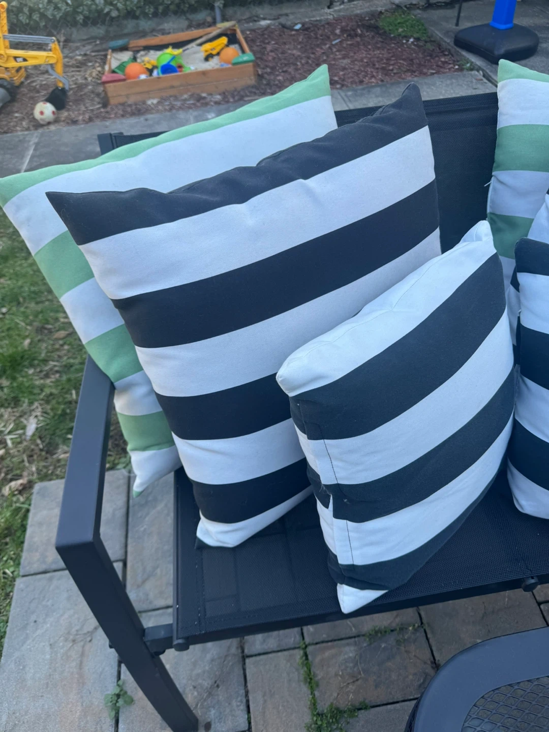 Add a pop of pattern to your outdoor seating with these five striped throw pillows. Features black, white, and light green stripes. They're perfect for enhancing the comfort and style of your patio furniture!
