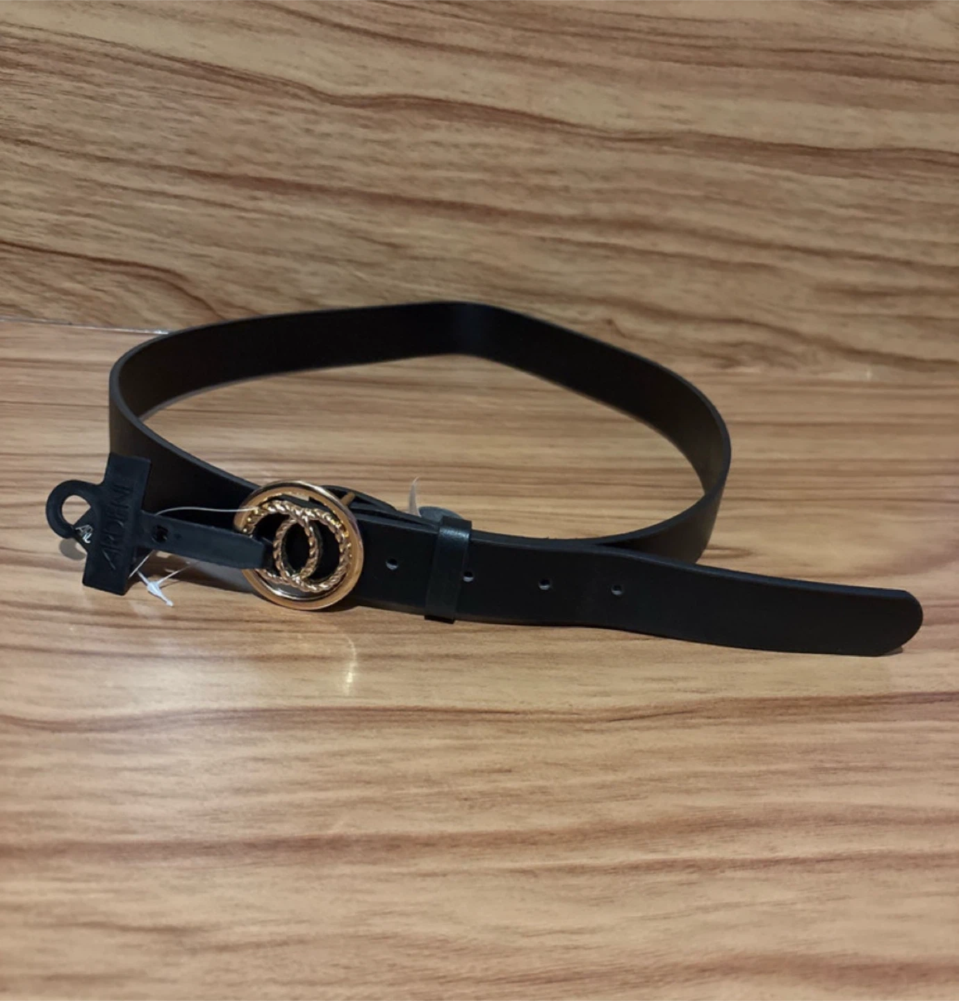 Add a touch of elegance to any outfit with this new Ardenes black belt, featuring a stylish gold buckle and original tags. This versatile accessory is perfect for cinching dresses, skirts, or pants, and its sleek design makes it a timeless addition to your wardrobe.
