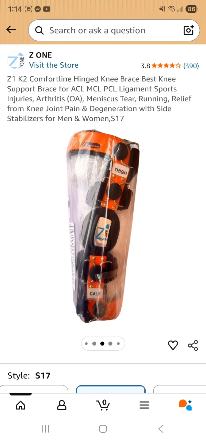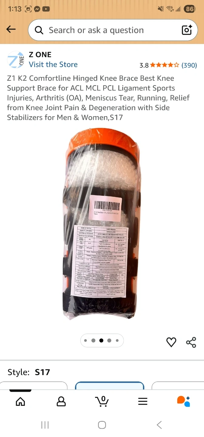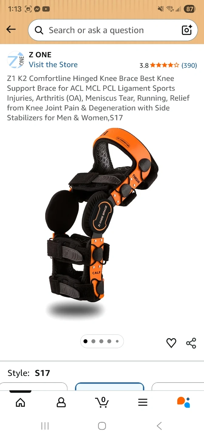 This is a Z One K2 Comfortline hinged knee brace. It's designed for ACL, MCL, and PCL ligament support. Features include double anti-slip silicone gel coated frames and soft neoprene condyles.