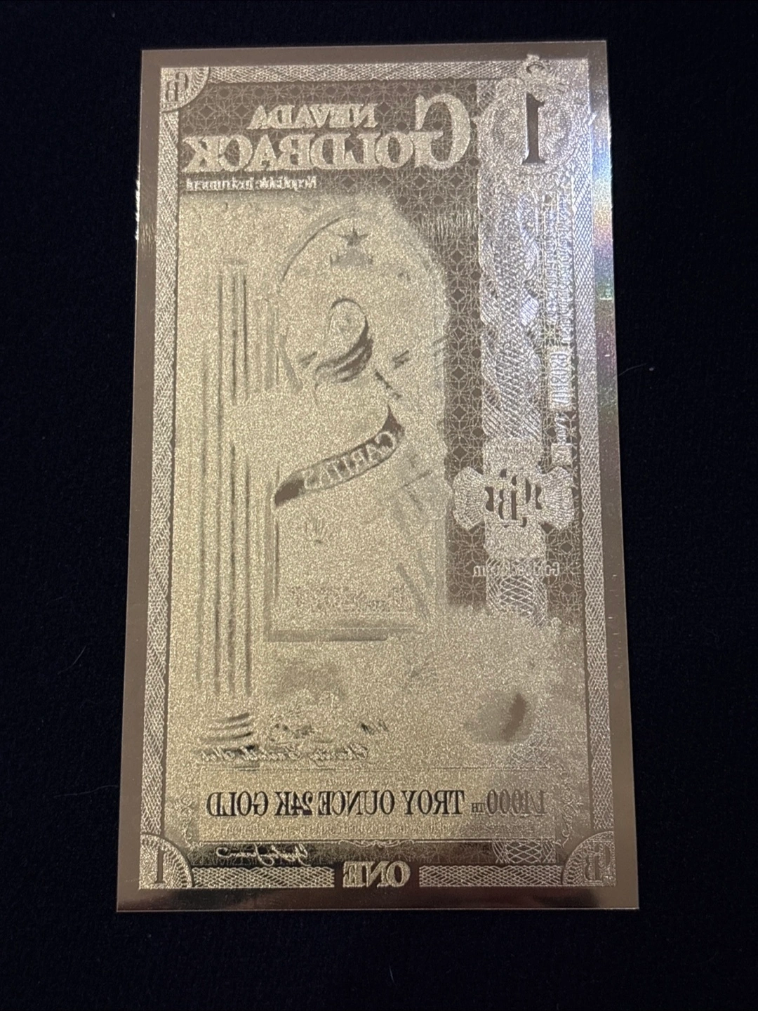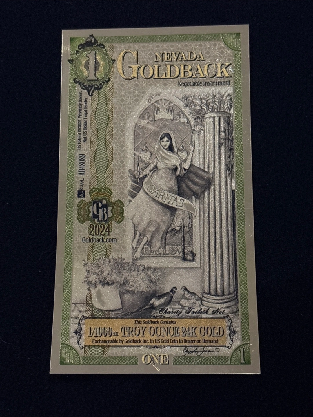 Selling a Nevada Goldback Negotiable Instrument. This Goldback contains 1/1000th Troy Ounce 24K Gold. Exchangeable by Goldback Inc. in US Gold Coin to Bearer on Demand