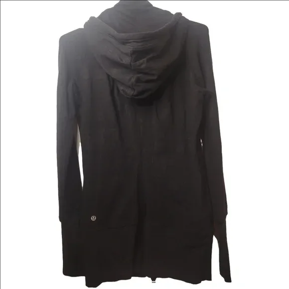 Selling a Lululemon black hoodie in size 4. It's in great condition and perfect for workouts or just lounging around. The hoodie features a full zip and thumbholes, making it extra cozy!