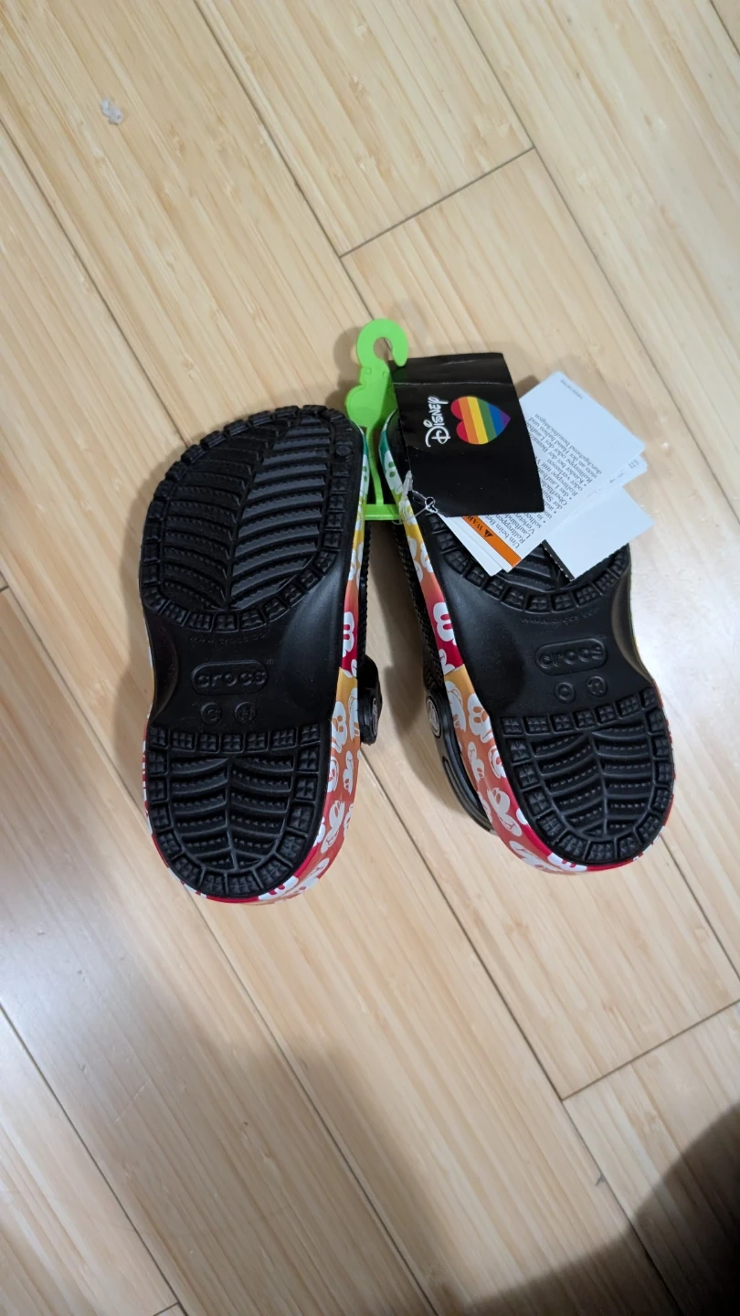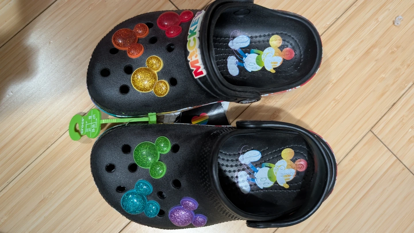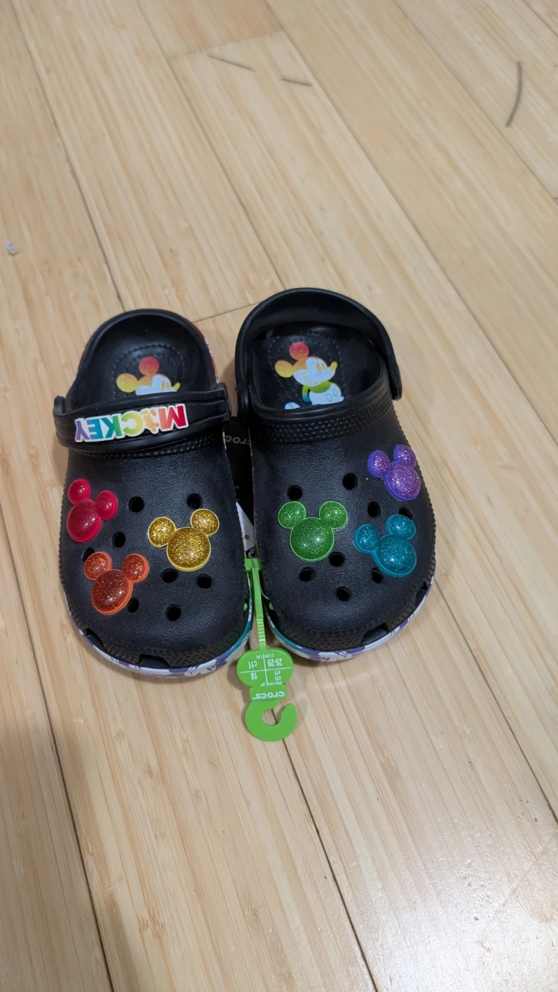 Crocs Classic Disney rainbow clogs for kids. Features Mickey Mouse graphics and glittery Jibbitz. Size is US 11, equivalent to EUR 29. Comes with original tags.
