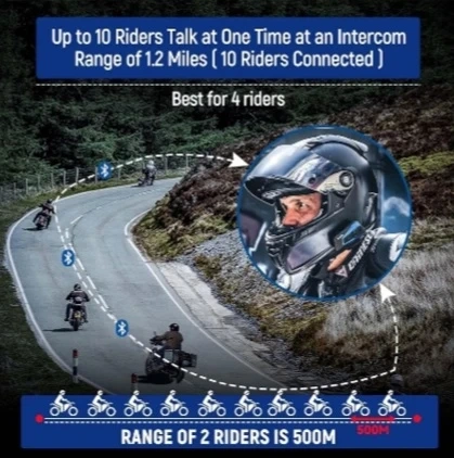 - Intercom range of 1.2 miles (with 10 riders connected)