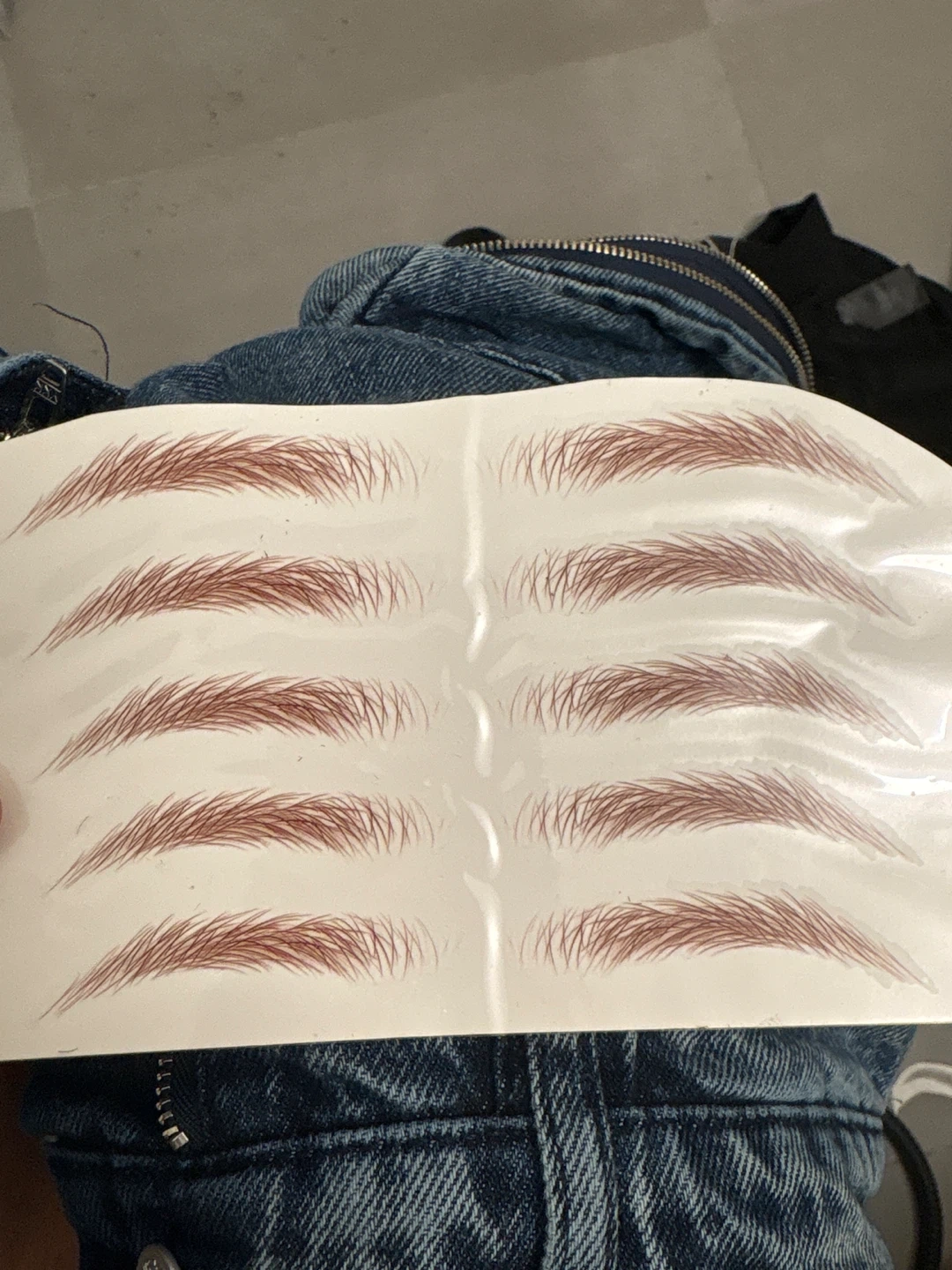 Sheet of 10 pairs of self-adhesive, temporary fake eyebrows. These realistic-looking brows come in a natural brown shade. Easy to apply for a quick beauty enhancement!