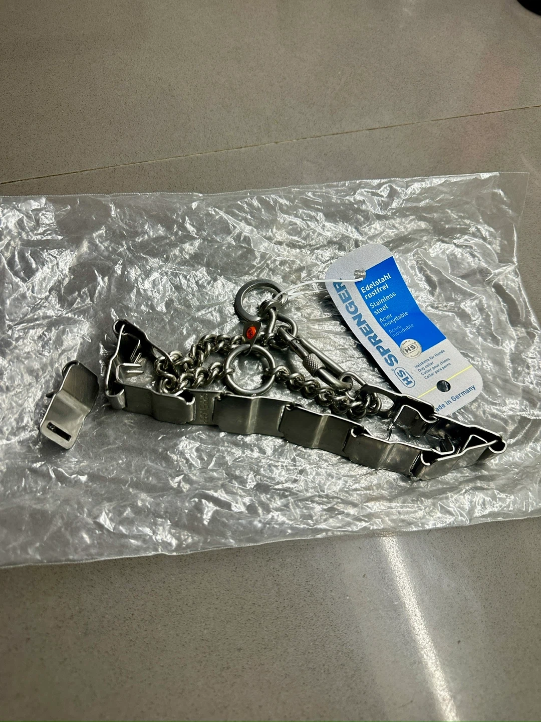 Probably the best puppy / dog training collar you can get. This is a ss steel adjustable link gentle prong collar by sprenger. I use an identical collar on my 75lb doberman daily. Its indestructible. This one is a new extra. Its very comfortable bc of the gentle prongs but highly effective for puppy or adult re-training.