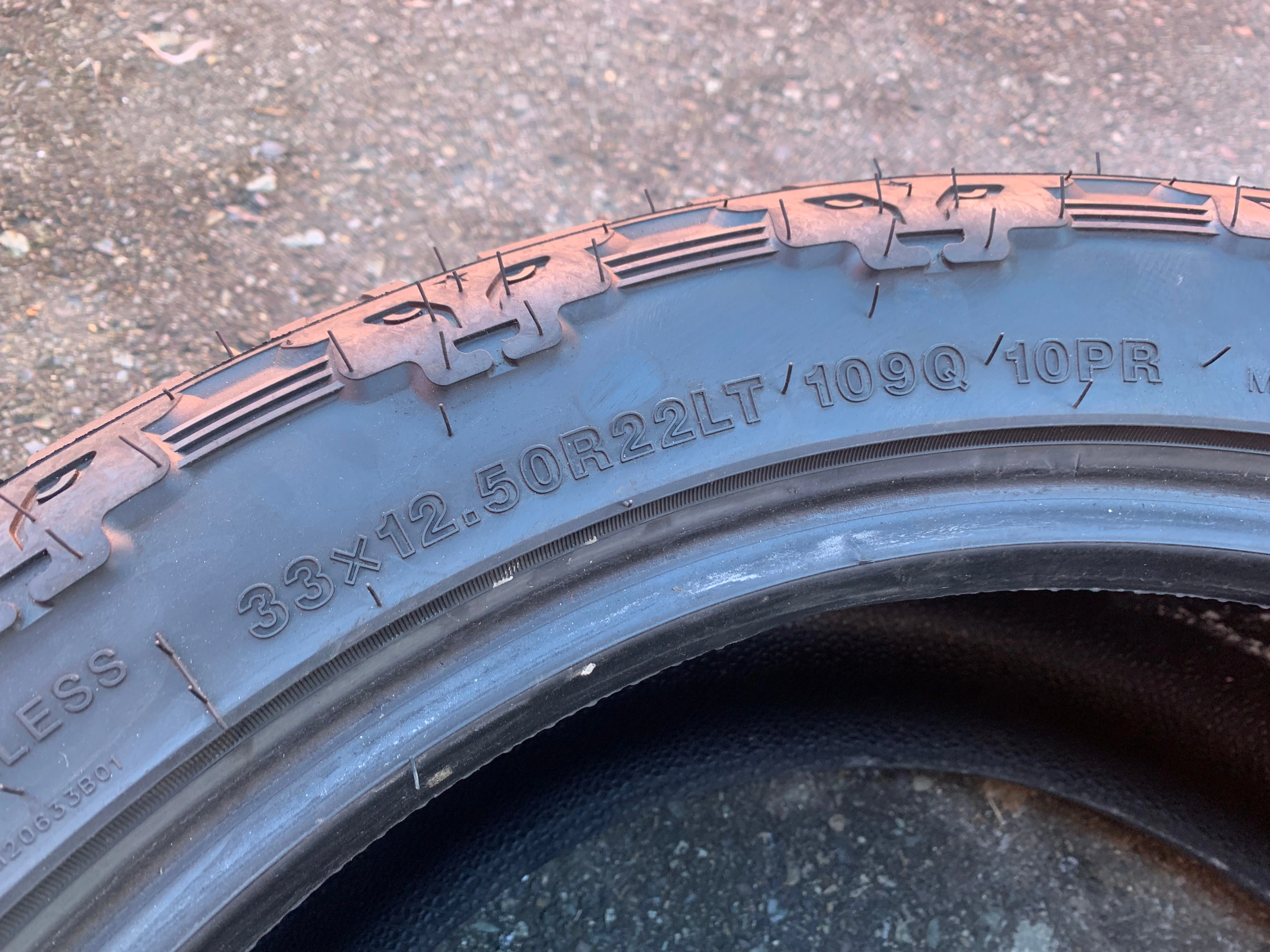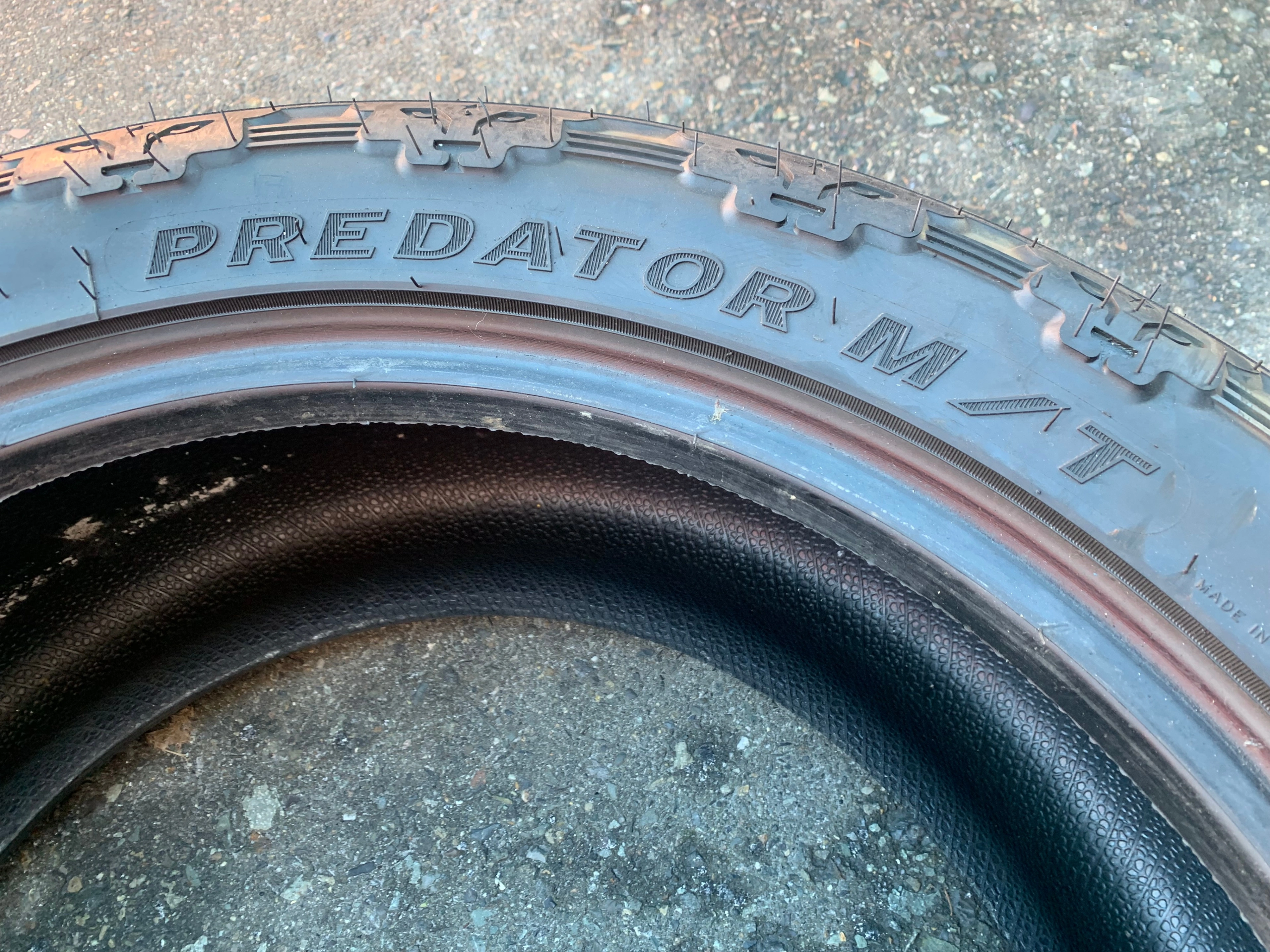 size LT 33X12.50R22 33X12.50X22 109Q 10PR M+S Grenlandar Predator M/T with no repairs and 80% tread