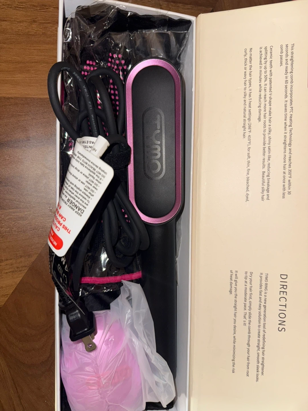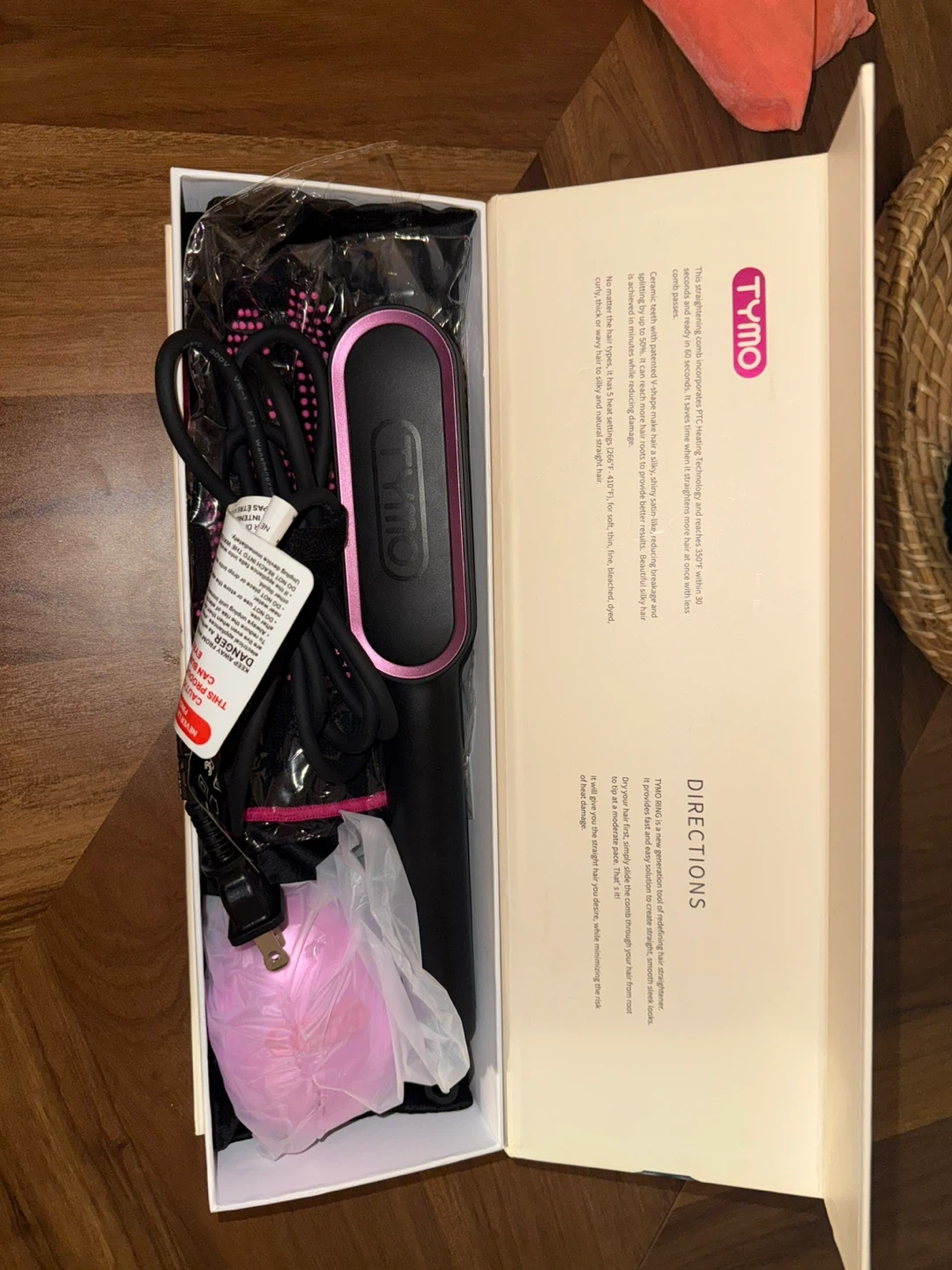 I'm selling a brand new TYMO Ring Hair Straightening Comb! It incorporates PTC Heating Technology and reaches 350°F within 30 seconds, ready to go in 60 seconds. It's a time-saver that straightens more hair at once with fewer passes. Comes with ceramic teeth with patented 3D heating that make hair silky, shiny, and reduce breakage and splitting by up to 50%. I can reach more hair roots to provide better results. Suitable for any hair, thick or thin, for soft, fine, bleached, dyed, curly, thick or easy hair to silky and natural straight hair look. The box is included!