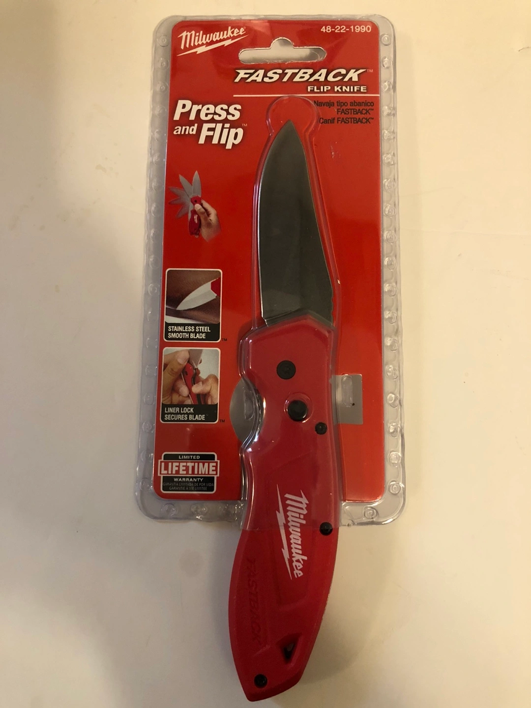 Selling a brand new Milwaukee FASTBACK Flip Knife, still in its original packaging! This knife features a stainless steel smooth blade and a liner lock to secure the blade. It also has a reversible belt clip for multiple carry positions. It's engineered by Milwaukee Tool and designed for professionals.