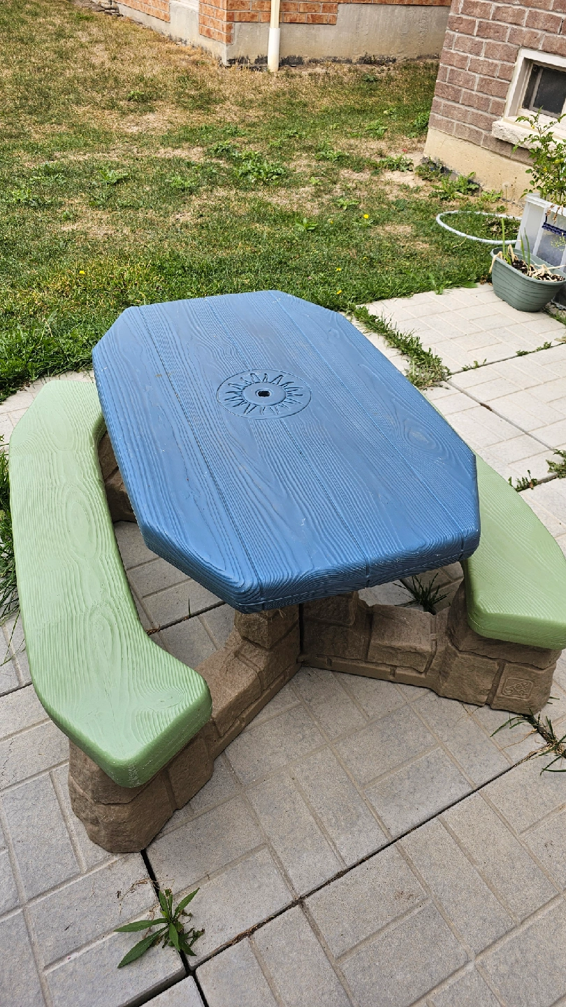 Little Tikes picnic table for kids! It's blue and green and perfect for outdoor fun and snacks. The table is in great shape and ready for a new home