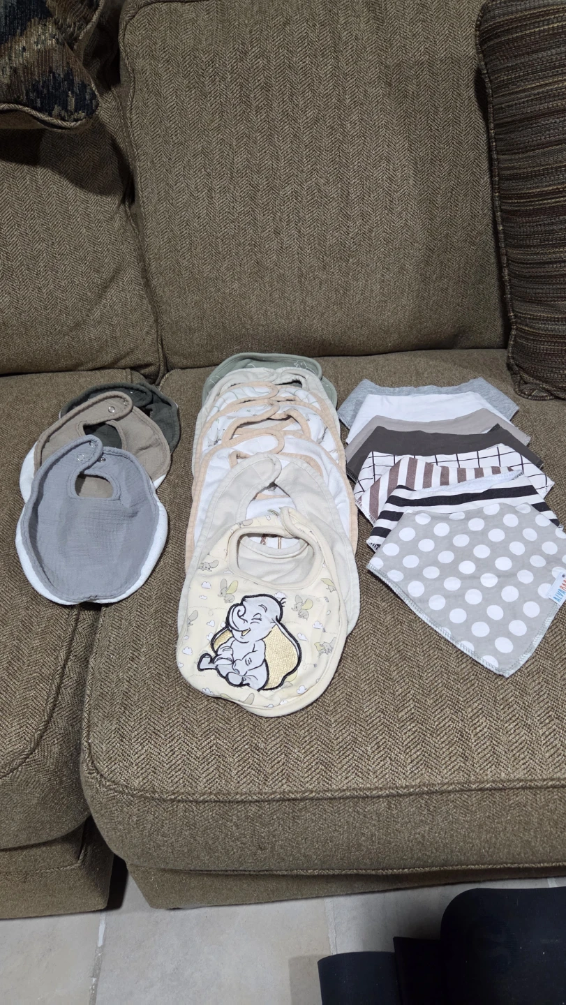 Selling a collection of baby bibs in various colours and patterns. They are in great condition and ready to protect your little one's outfits during meal times! Perfect for babies and toddlers. 18 bibs in total