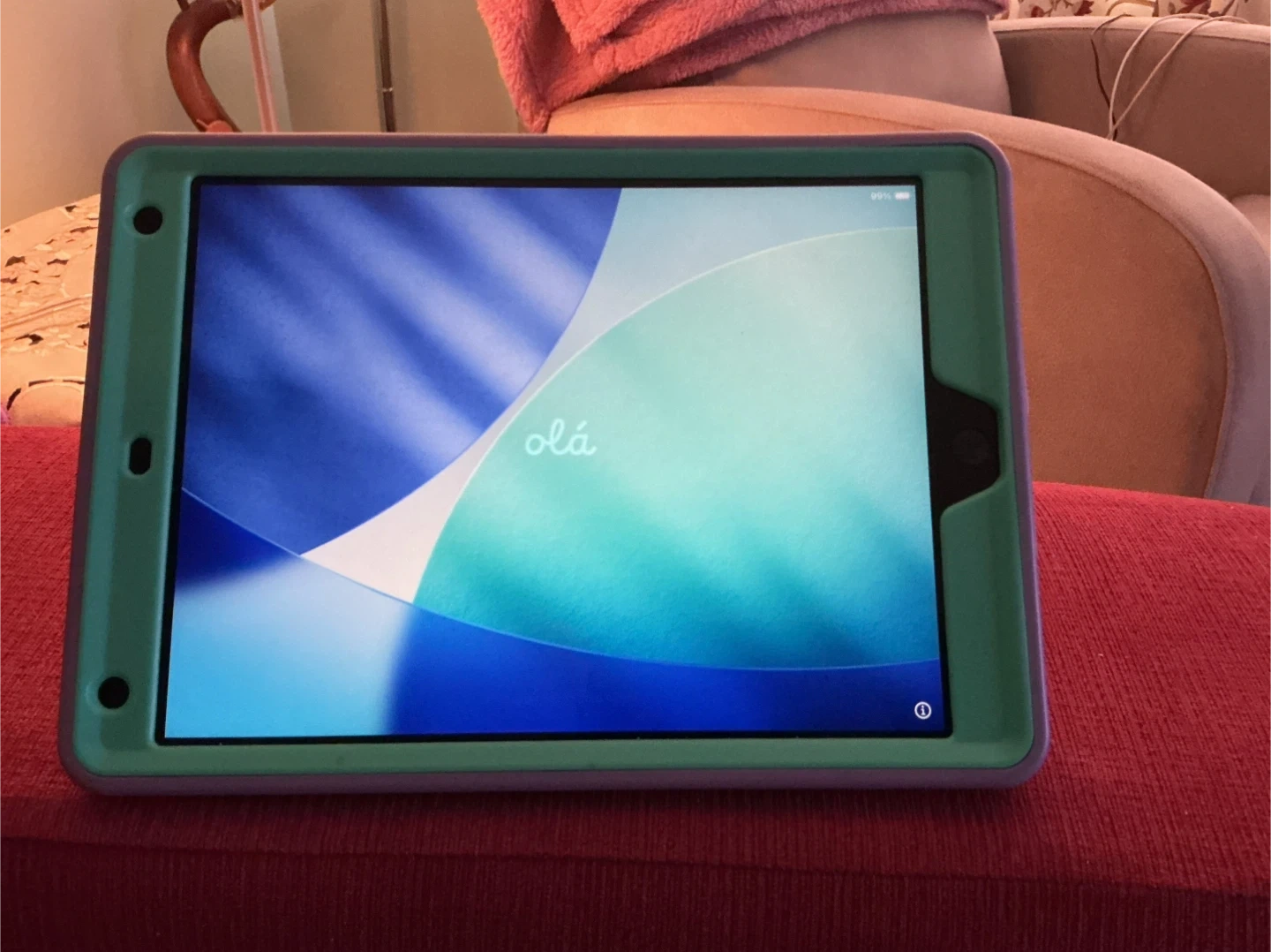 This is an Apple iPad tablet. It comes with a teal and purple protective case. The tablet is in good working condition.