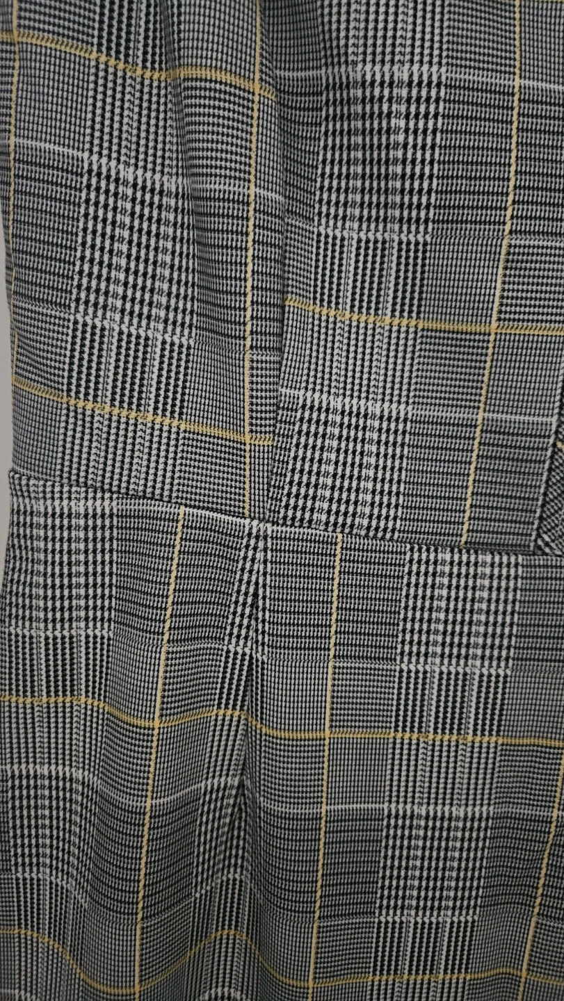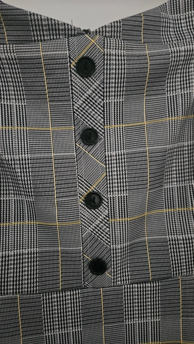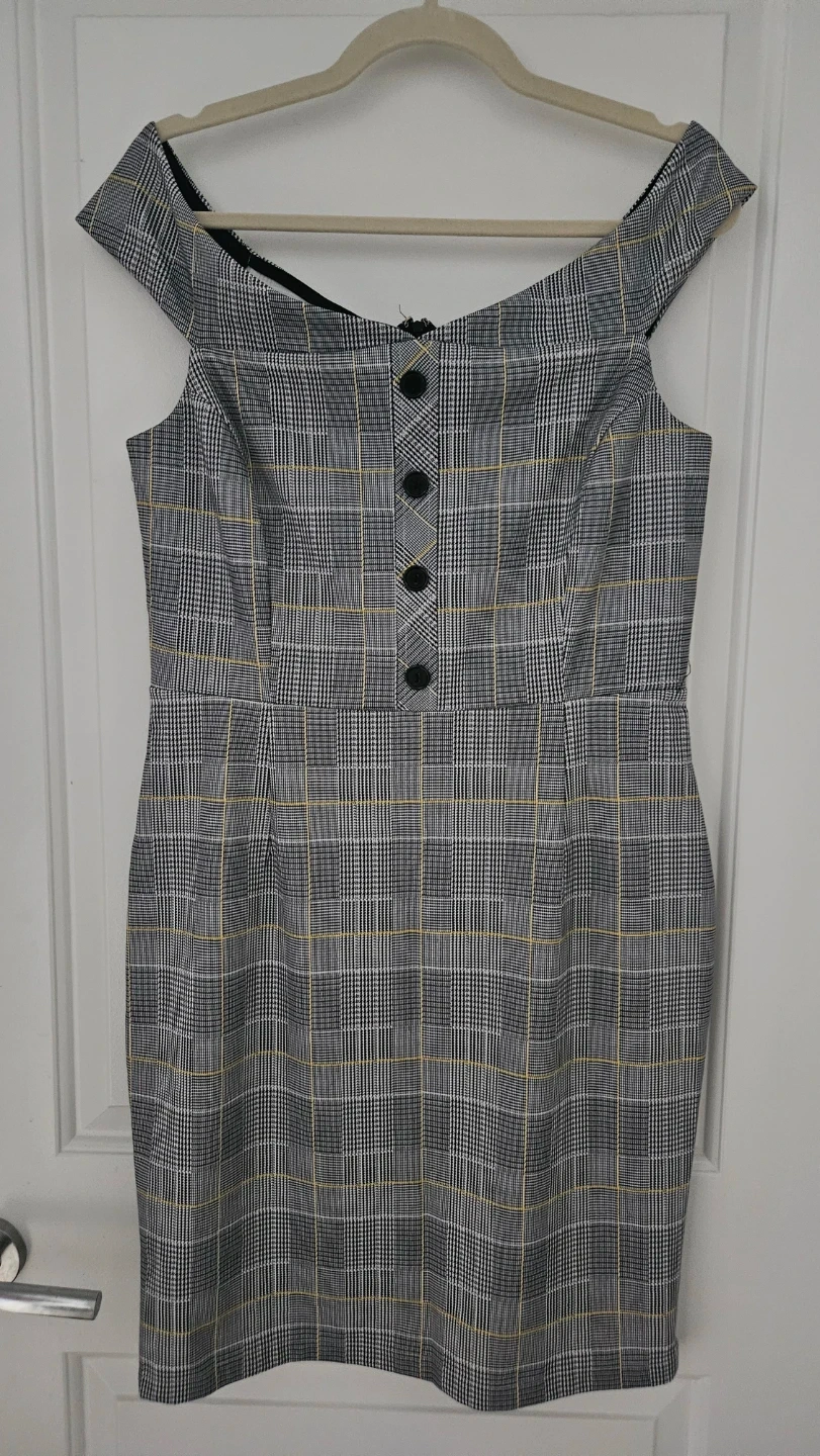 Selling a RICKI'S off-the-shoulder dress in a size 10. It features a classic plaid pattern with black, white, and yellow accents. The dress has button details down the front and a zippered back closure. It's a great option for a casual outing or a more dressed-up event!