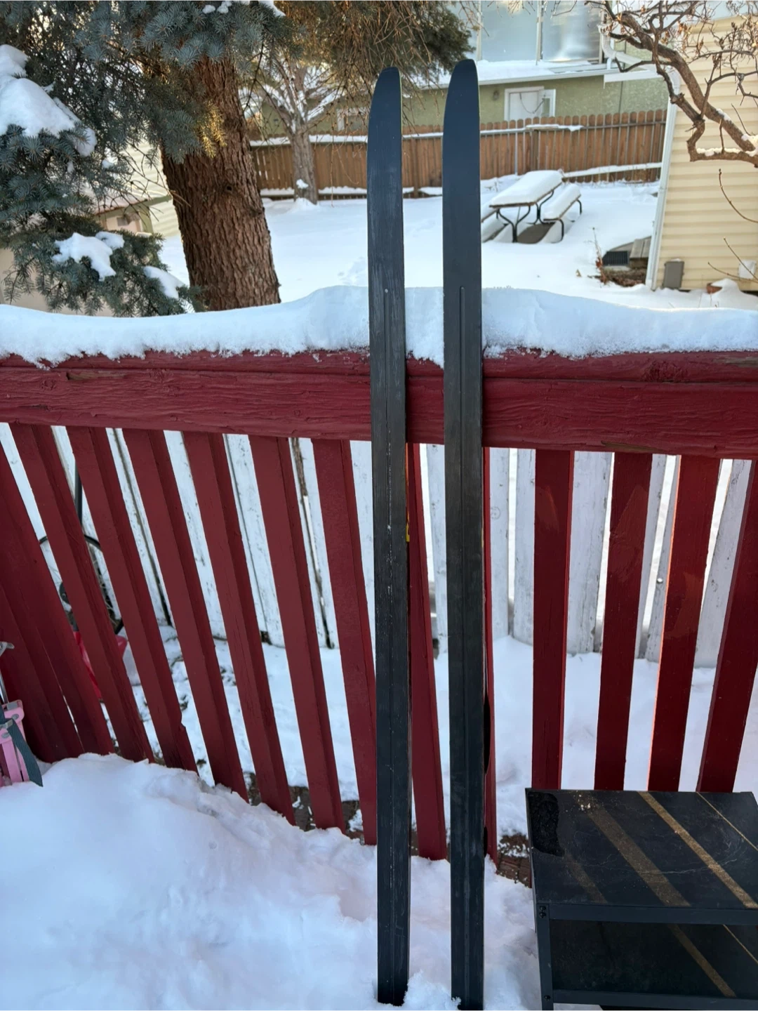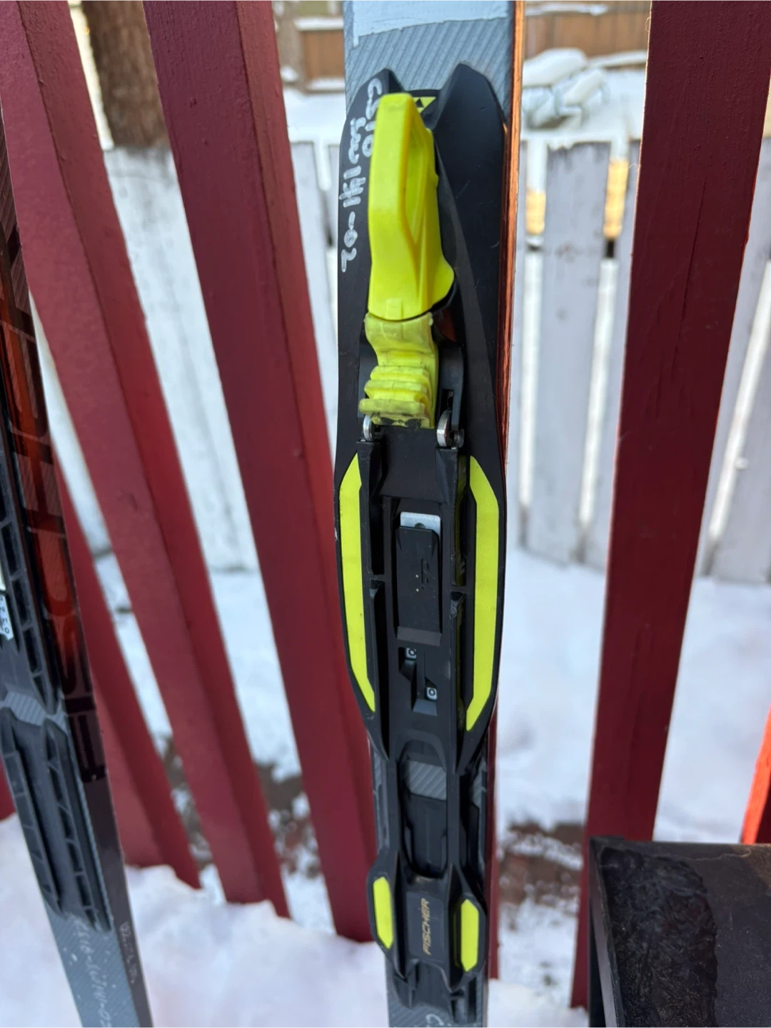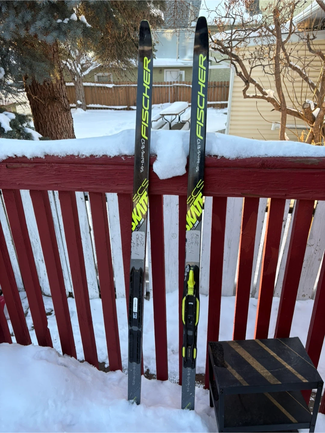 These Fischer cross-country skis needs new blinders. They're great for hitting the trails this winter. Black and yellow design.