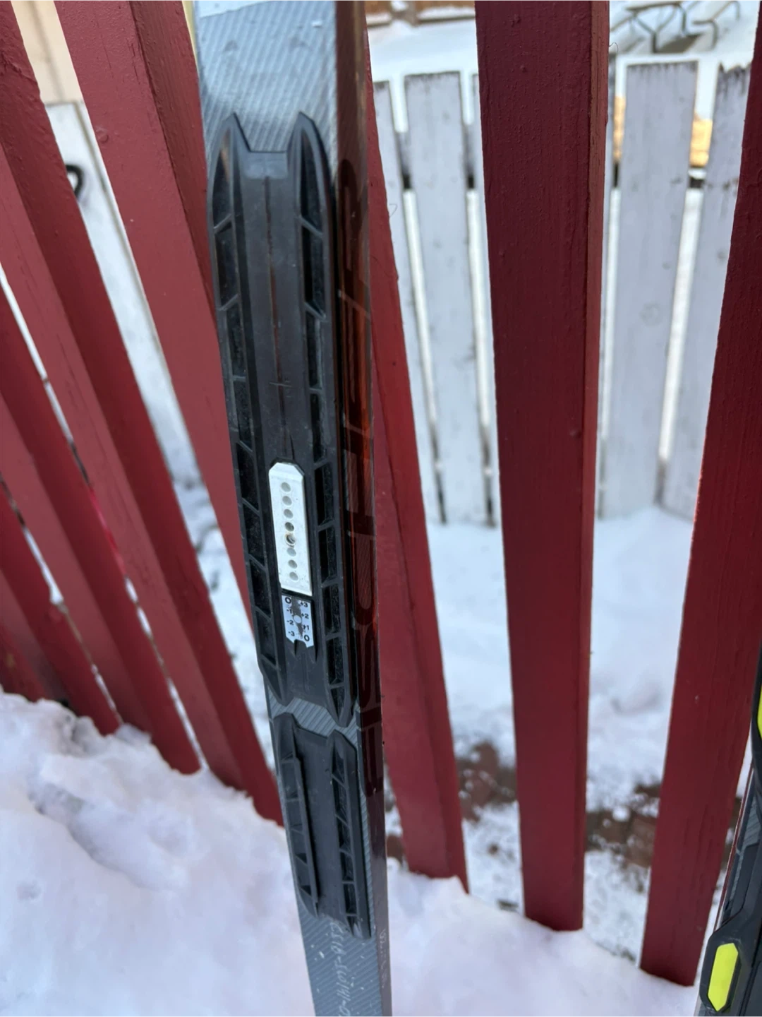 These Fischer cross-country skis needs new blinders. They're great for hitting the trails this winter. Black and yellow design.