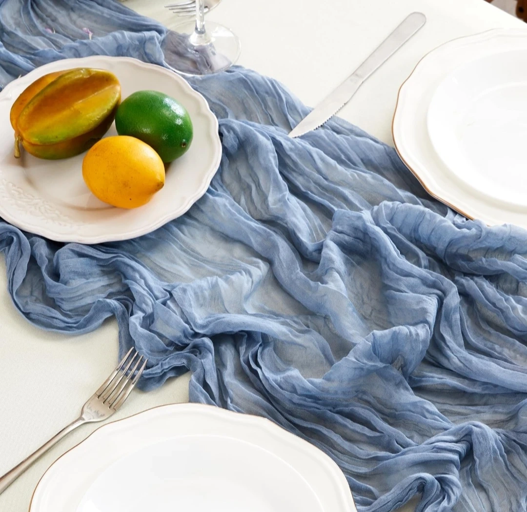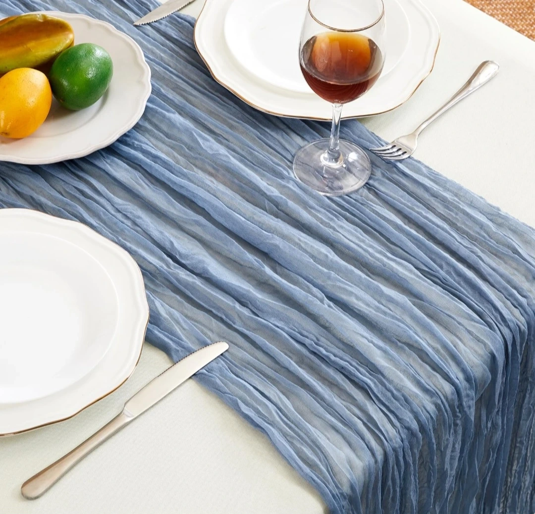 These table runner features a cheesecloth fabric in a dusty blue shade. It measures 120 inches long and 35 inches wide, perfect for dressing up your dining table. The flowing, wrinkled texture adds a romantic and elegant touch to any setting.