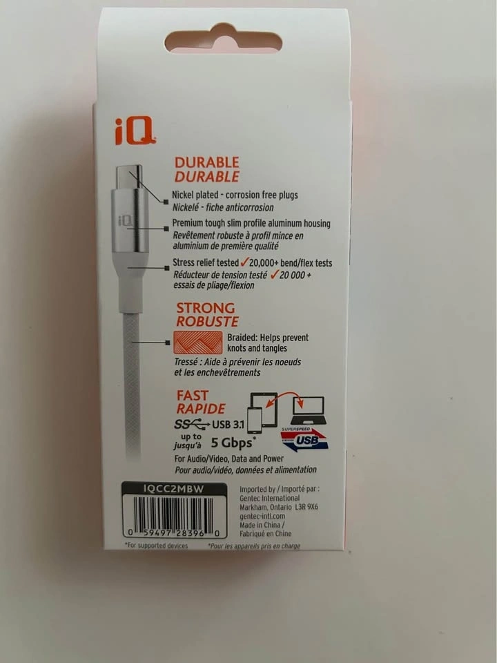 Brand New in Sealed Box iQ USB Type-C to Type-C Cable - Braided - 1.8m/6ft. Retail $30. Public meet Warden and 16th avenue area in Markham. Cash only please. This offers effortless connectivity and rapid data transfer in a durable, stylish package. Designed for high performance and long-lasting use, this cable is perfect for all your USB-C devices at home, at work, or on the go. Durable Design: Elegant braided finish prevents knots and tangles, ensuring a long-lasting and reliable connection. High-Speed Data Transfer: USB 3.1 technology supports data transfer speeds up to 5 Gbps, perfect for audio, video, data, and power.