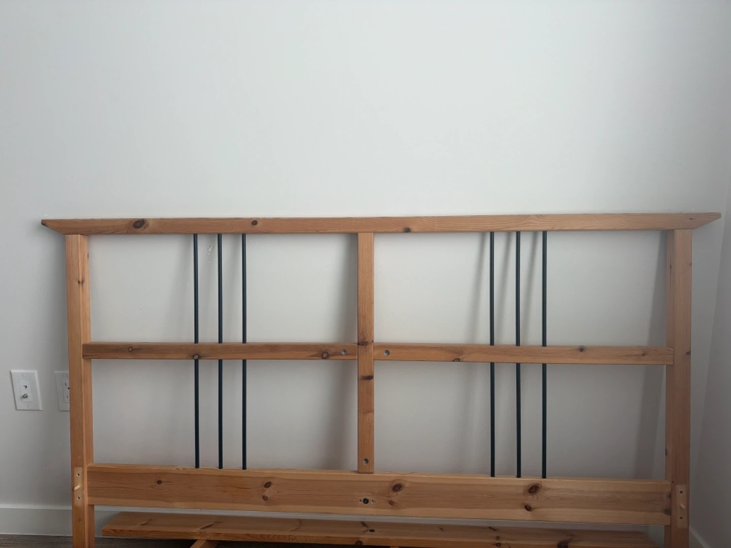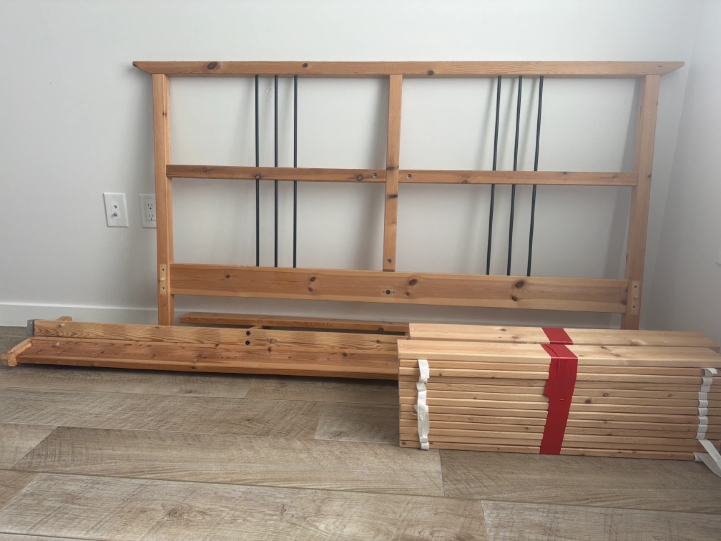 This is a queen size bed frame with included bed base. The headboard is made of natural wood and features a slatted design with dark vertical supports. All necessary components for assembly are present.