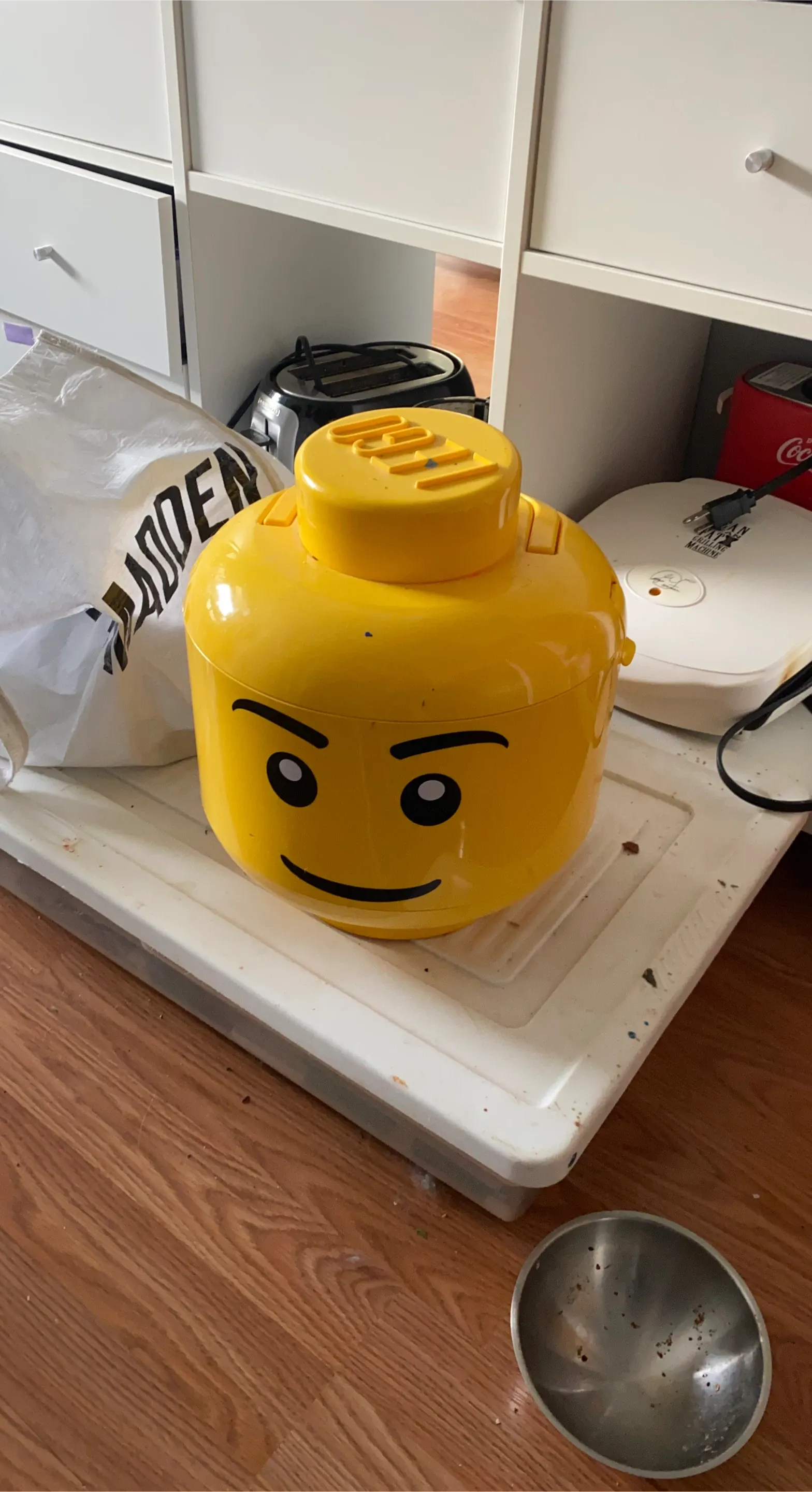 Yellow LEGO head storage bin with a classic minifigure face. It's great for storing toys or other small items. This bin is made of plastic.