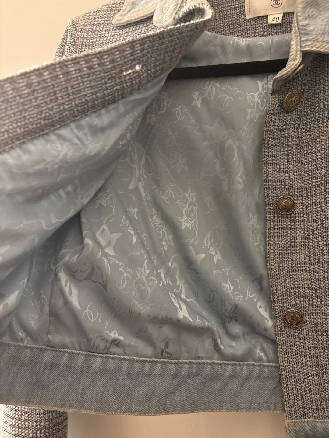 A stylish Chanel jacket combining denim and tweed elements. It features a light blue satin lining with a delicate floral pattern. The size is 40, perfect for a fashionable statement.