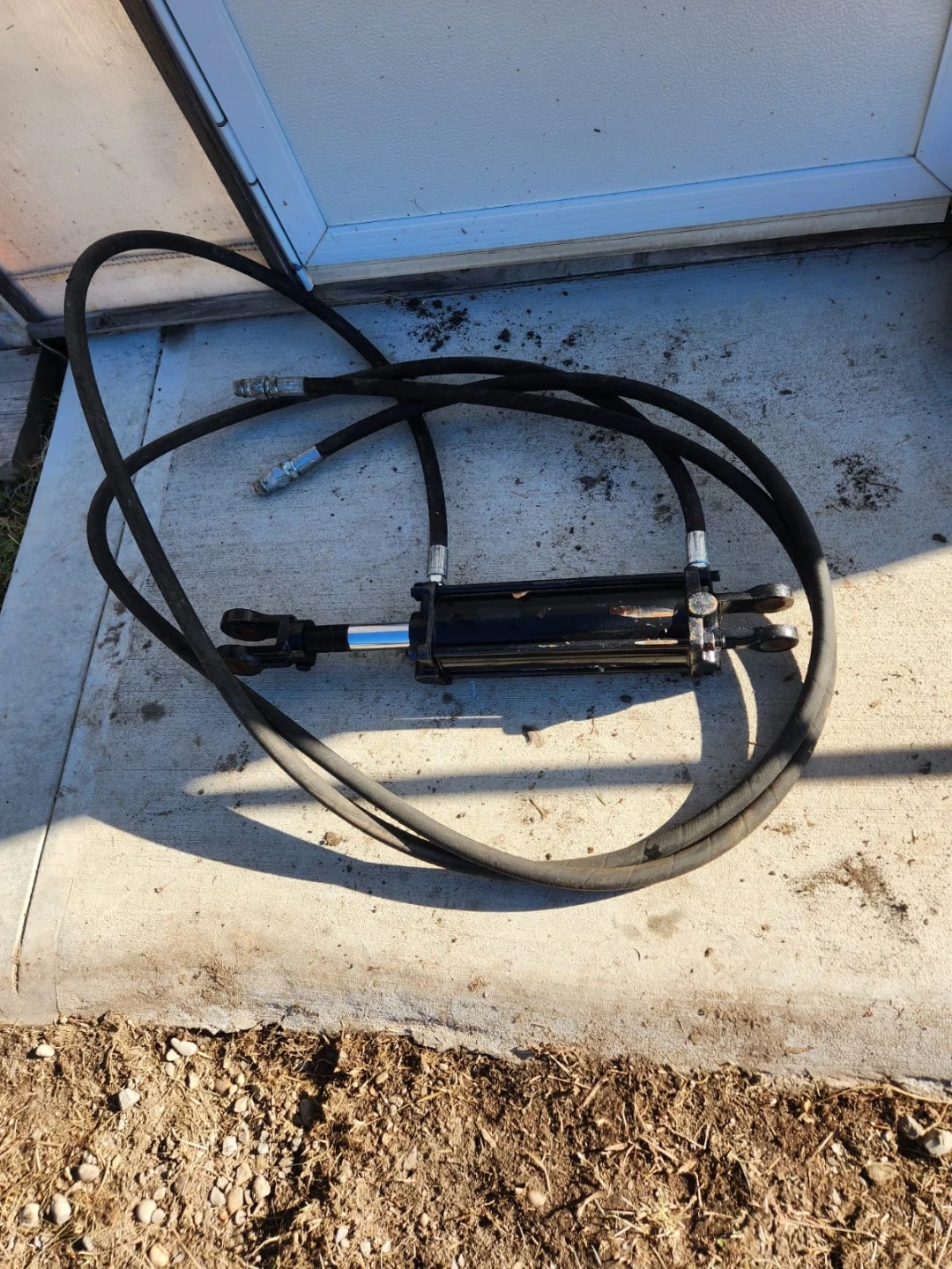 Black hydraulic cylinder with attached hoses. Appears to be a standard size for farm or industrial equipment. Ready to be put to work! Please call 780-621-1059