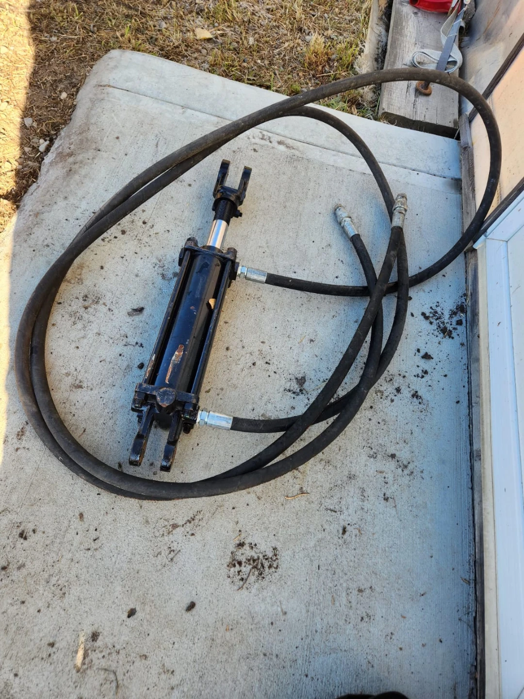 Black hydraulic cylinder with attached hoses. Appears to be a standard size for farm or industrial equipment. Ready to be put to work! Please call 780-621-1059