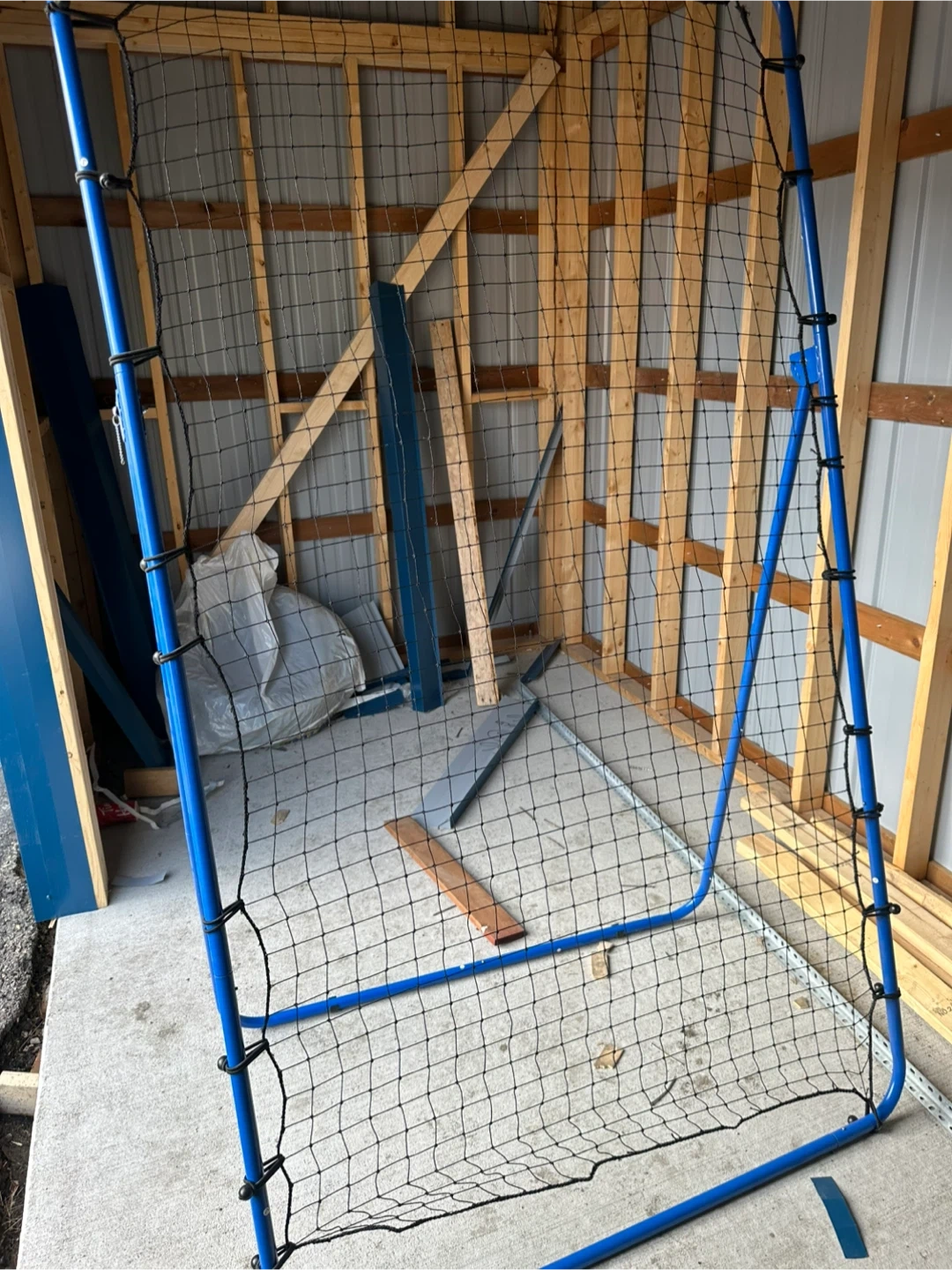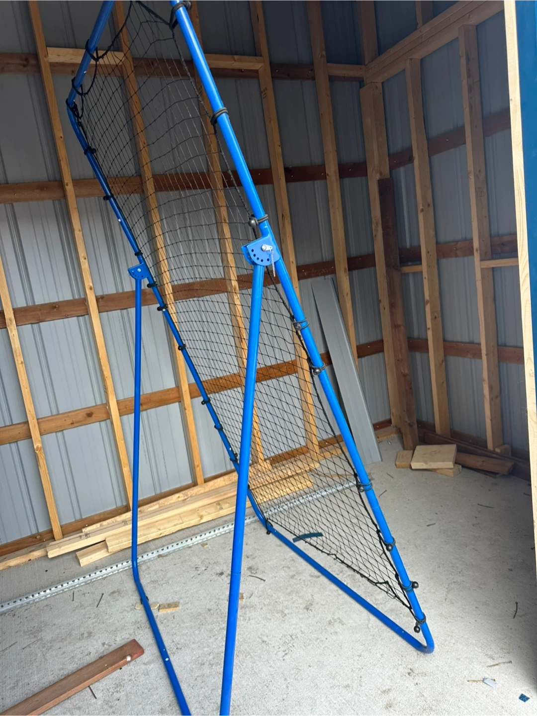 Blue metal frame pitching net with black netting. It's a good size for baseball or softball practice. Ready for your next game!