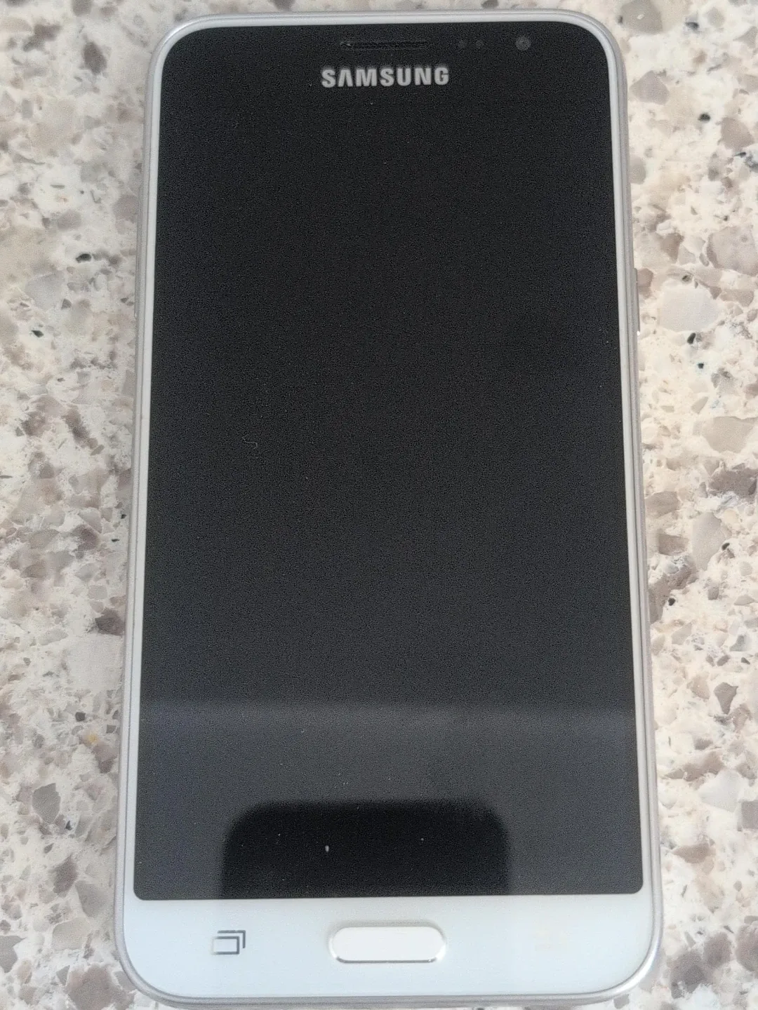 This is a white Samsung Galaxy Amp Prime phone. It's a Cricket Wireless model. The phone has a white front and back with silver trim. Cash only