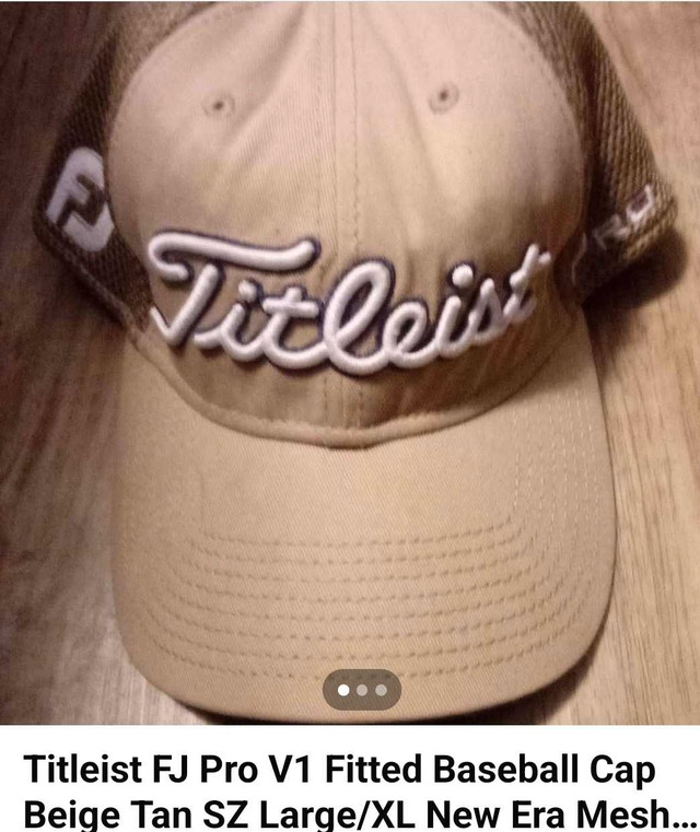 Up for sale is a Titleist FJ Pro V1 fitted baseball cap, perfect for golfers and fans alike. It's a stylish beige tan colour, size Large/XL, and features a New Era mesh design for breathability. This hat is in excellent condition, ready to wear on the course or for casual outings. While it's been previously enjoyed, it's been well cared for and looks fantastic. The Titleist logo is prominently displayed. Looking at similar listings, a fair price for this hat is around $30.00 CAD. If the ad is up, it's available!