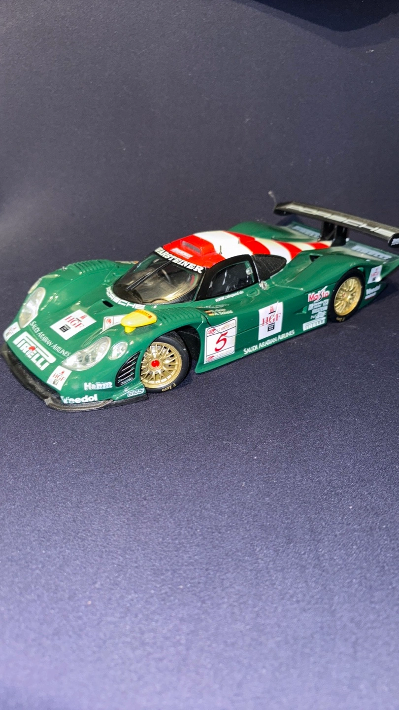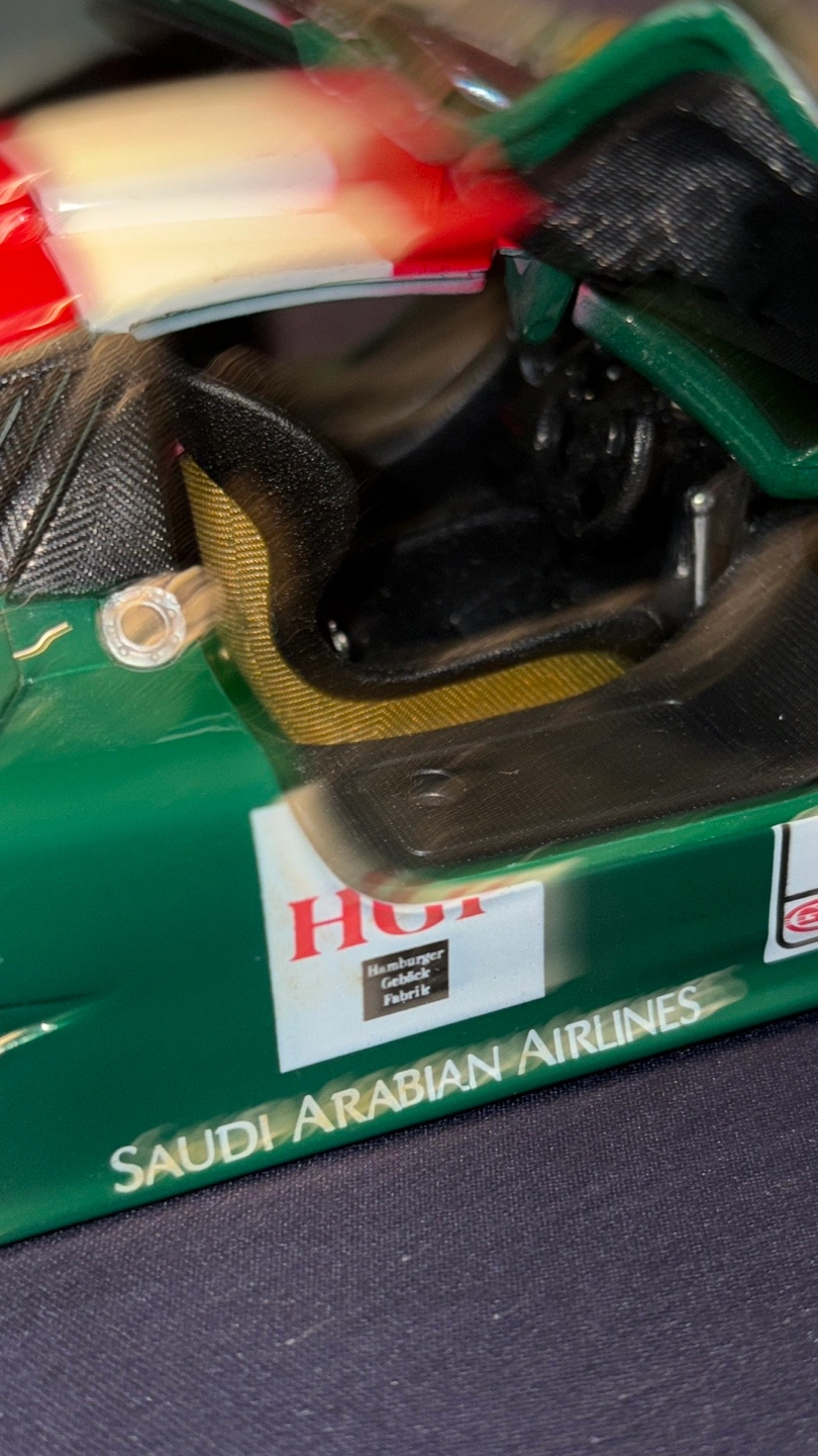 Detailed collectible model car. Green with red and white accents. Features sponsors like Warsteiner, Pirelli, and Saudi Arabian Airlines. Number 5. Some minor wear.
