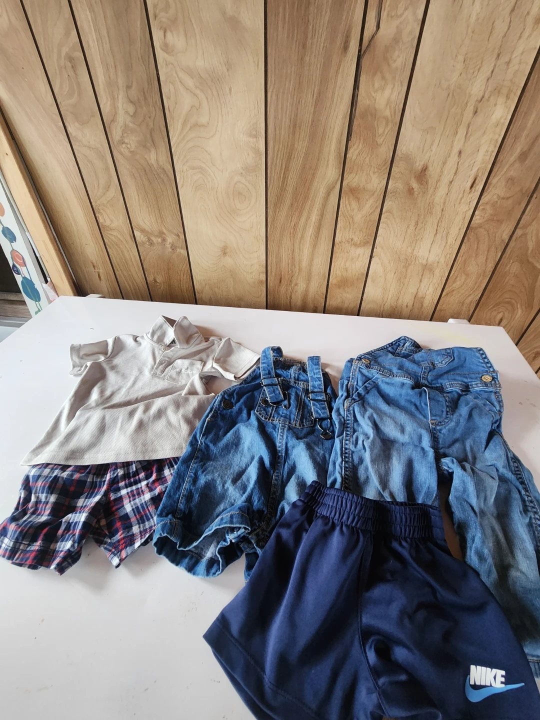 Bundle includes a tan polo shirt, blue denim overalls, plaid shorts, and navy athletic shorts. The navy shorts have a white Nike logo. It's a great mix for warm weather play!