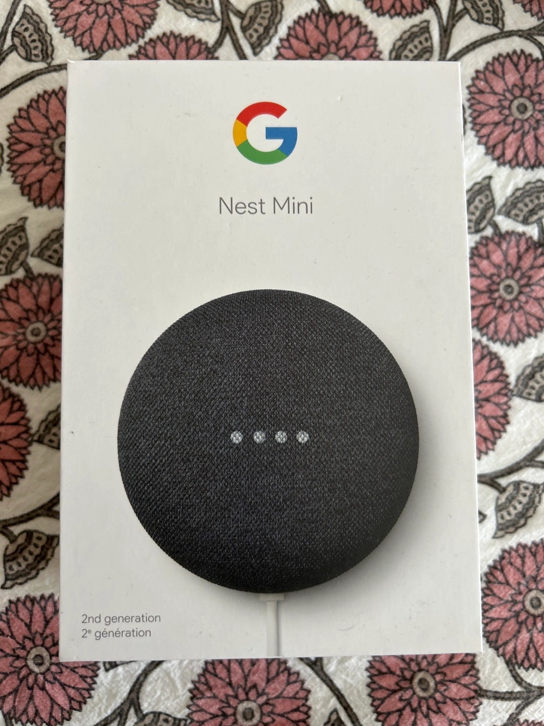 In the original packaging. A Google Nest Mini can be used to play relaxing music. The box shows a small, round, dark-coloured speaker.