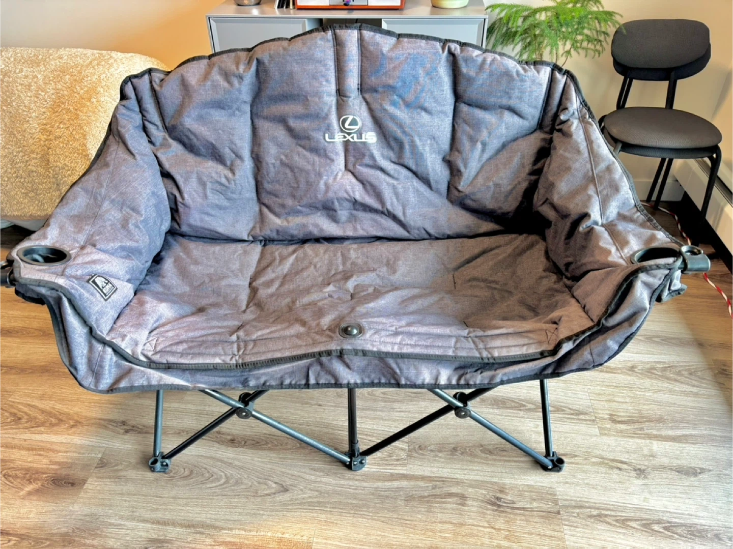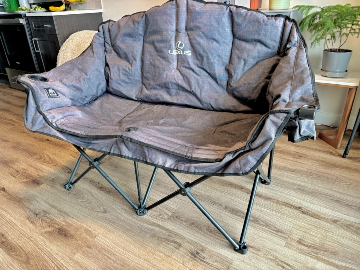 Quality Kuma 2 seater fold up loveseat. Great for the lake, camping or patios & balcony. Folds down to carrier bag for easy transportation! Has Lexus logo as it was purchased at Lexus of Edmonton for $129 grey & black.