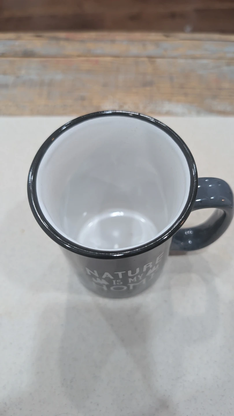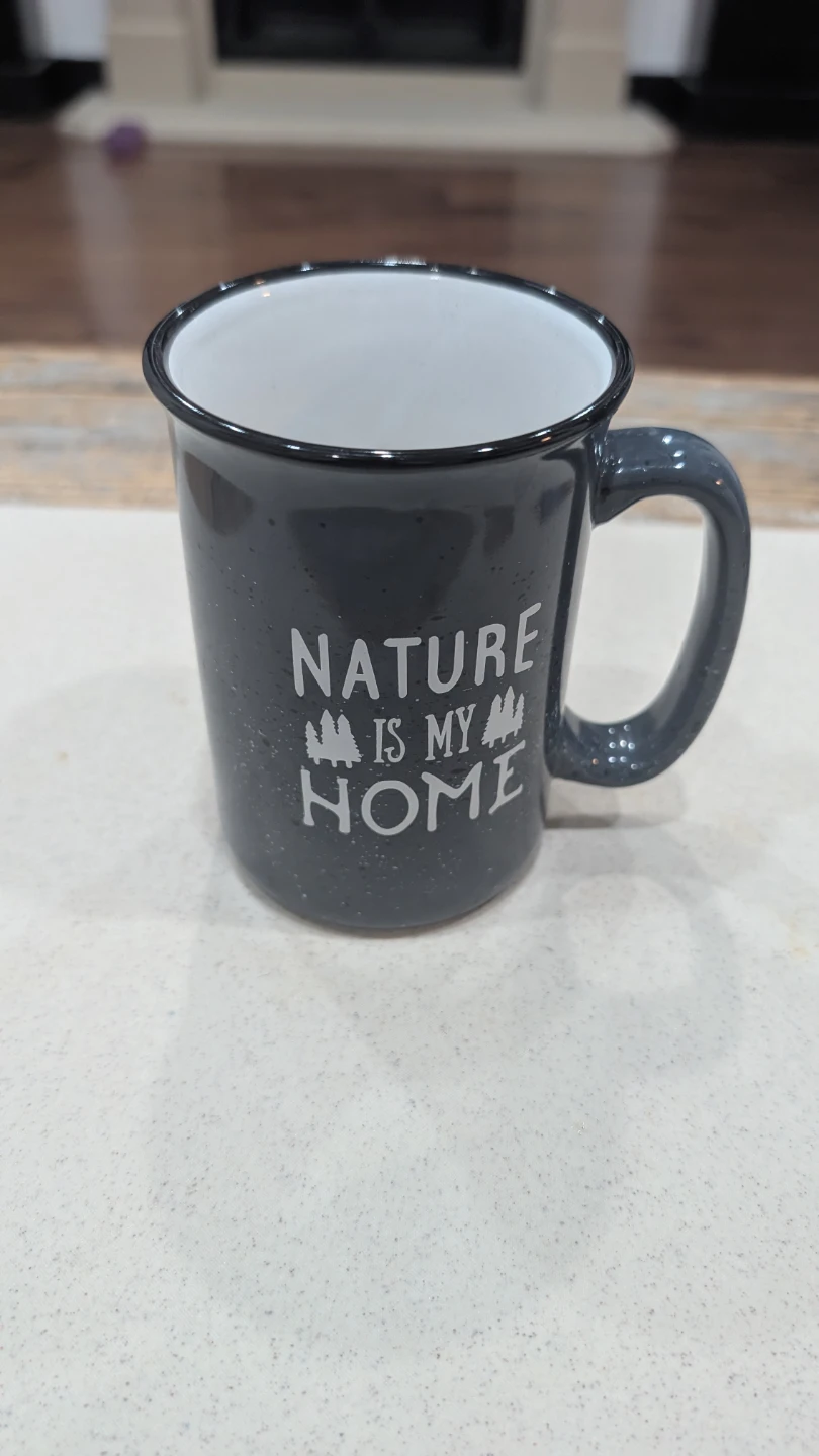 This dark grey mug features a "Nature Is My Home" design with trees. It has a speckled enamel look and a sturdy handle. This mug is great for enjoying your favourite hot beverage outdoors or bringing a bit of the outdoors in!