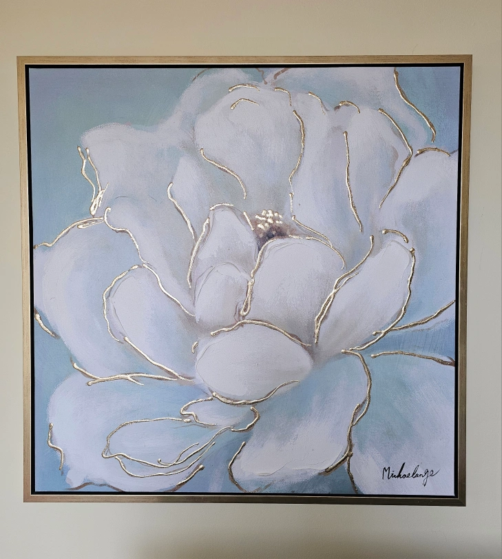 An attractive floral painting on canvas. Features a large white flower with golden outlines. Painting is encased in a gold frame. You may find this piece a very calming addition to your space. by Michael Lange