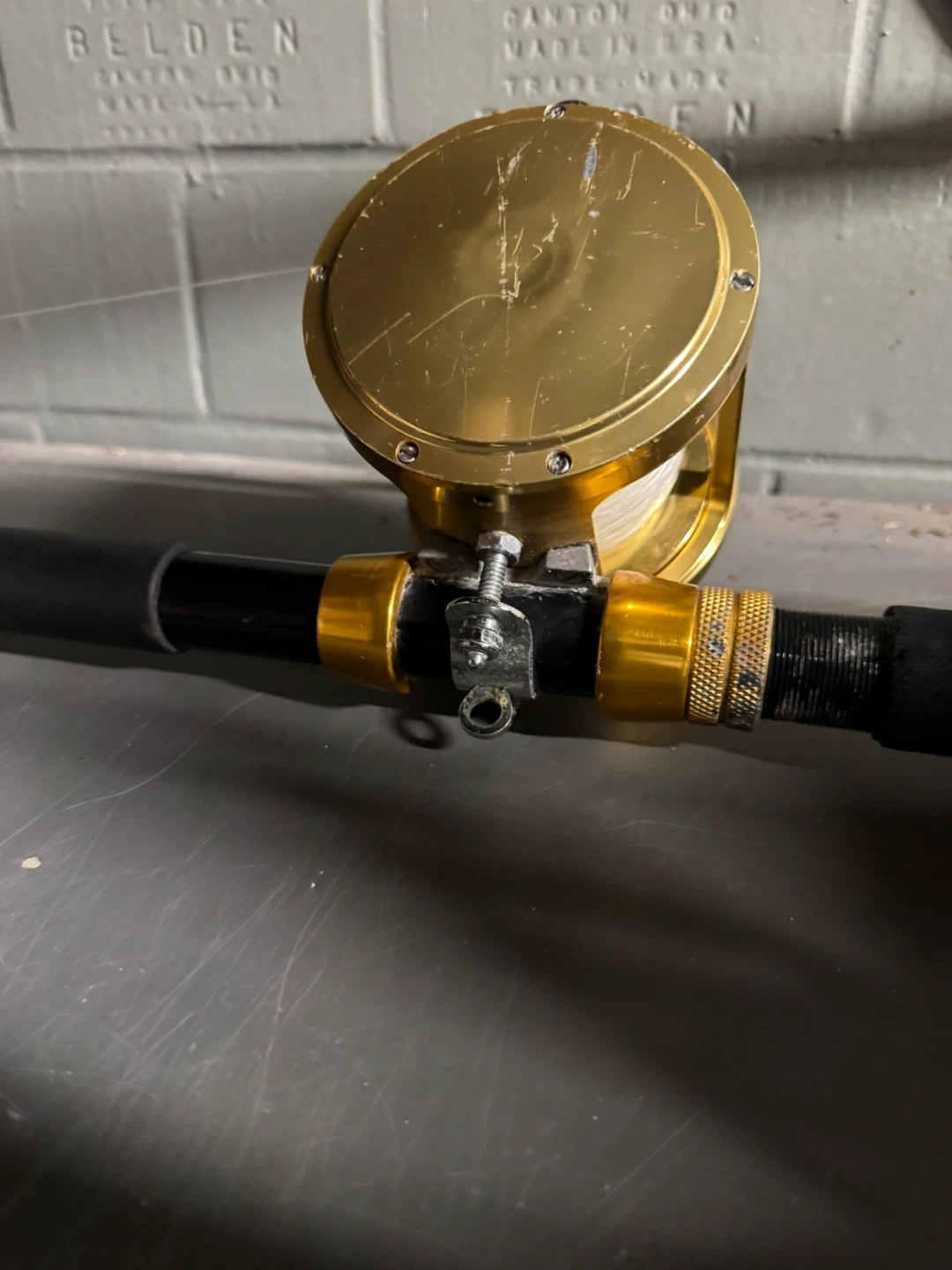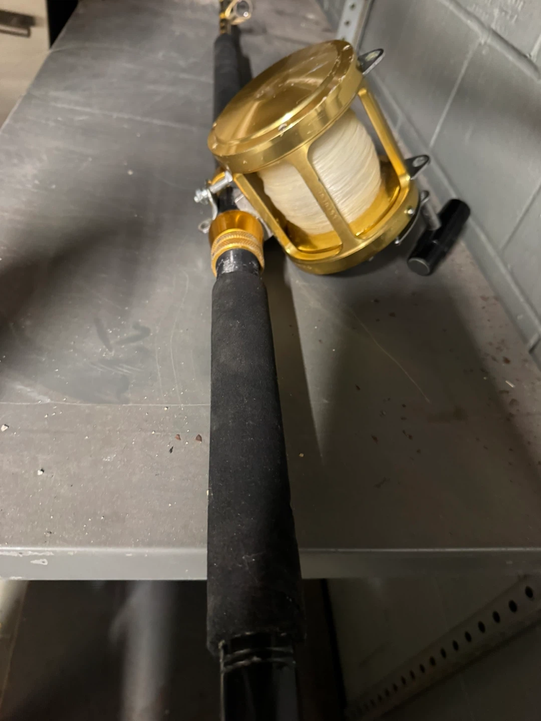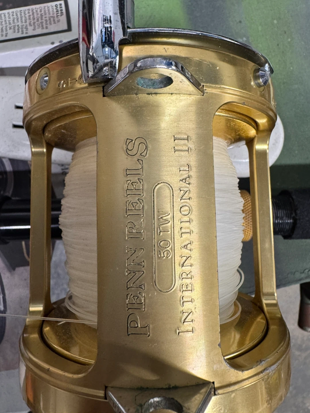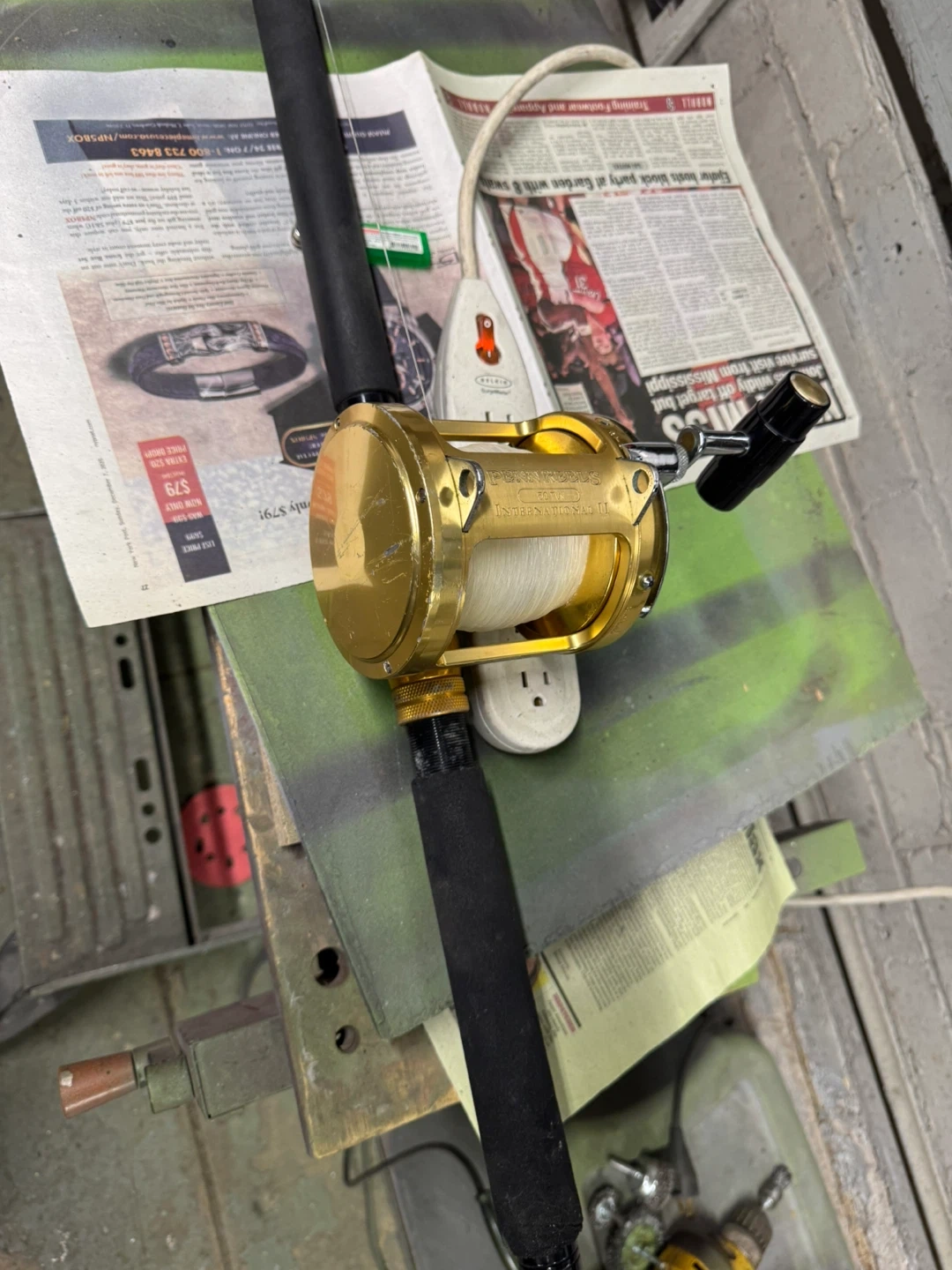 This is a PENN International II 50 TW fishing rod and reel combo. It's a gold-colored reel with line on it. This combo is ready for your next fishing trip!