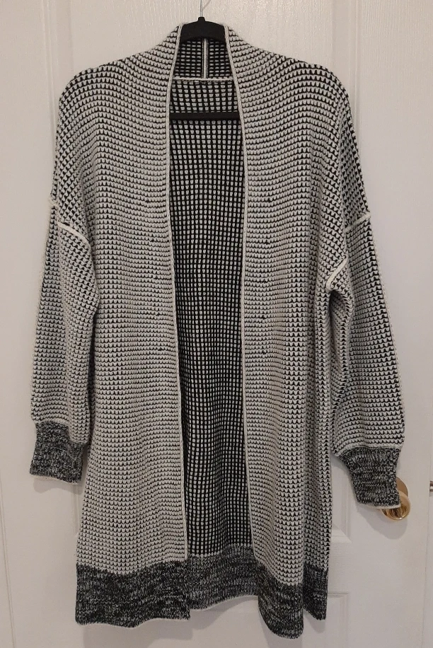 NEW, Never Used Cardigan - Smart looking, close knit and warm! Black-White-Grey, can be worn reversed also. I don't know what brand this is, was purchased online 2 years ago. It was long for me so never worn.