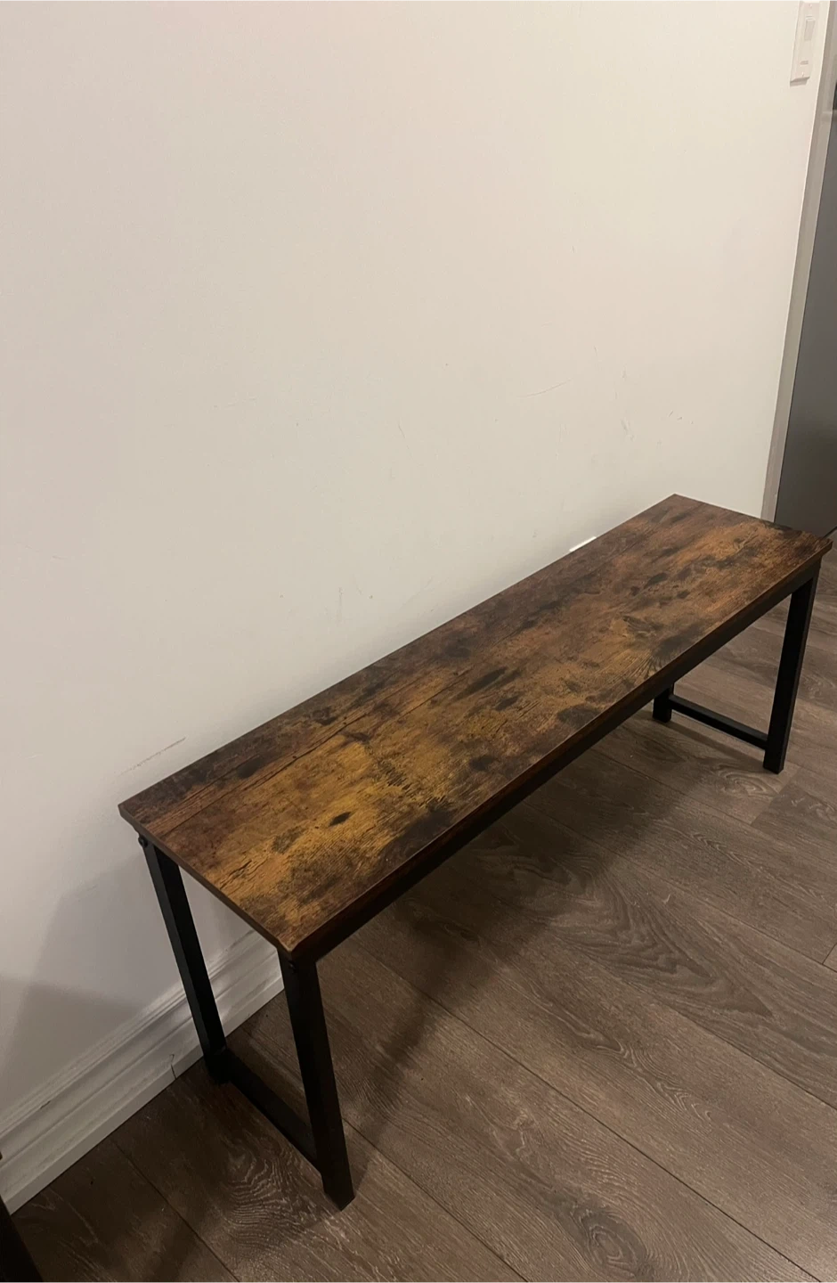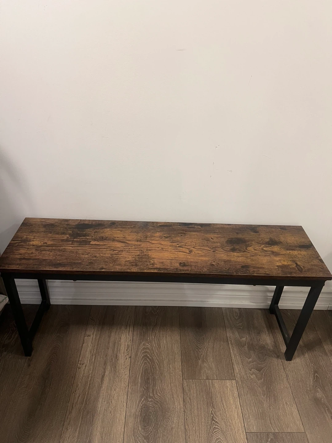 A stylish hallway bench with a rustic wood-look top and sturdy black metal legs. It's perfect for entryways or at the foot of a bed. Measures approximately 40 inches long.