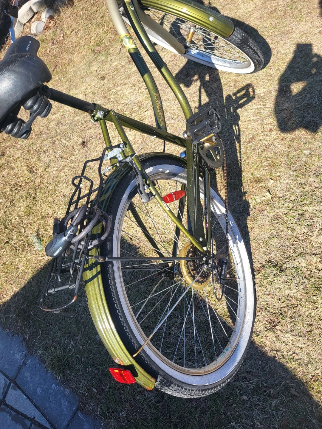 This is a green cruiser bicycle. It has a comfortable seat and a rear rack for carrying items. The handlebars have a bell attached. Great for leisurely rides around town!
