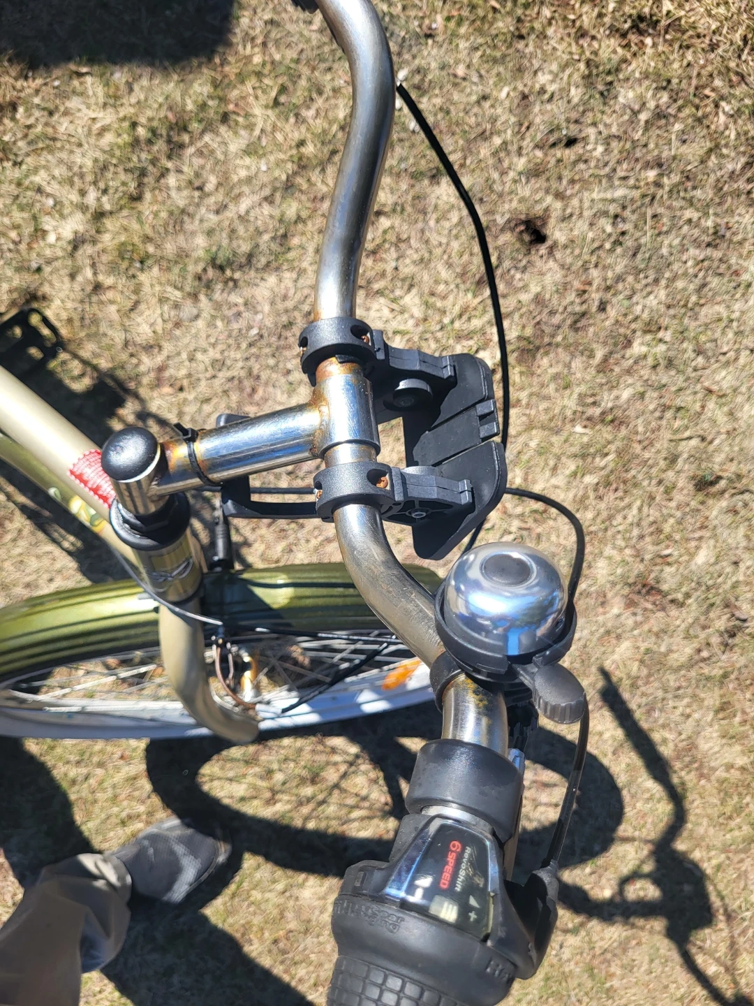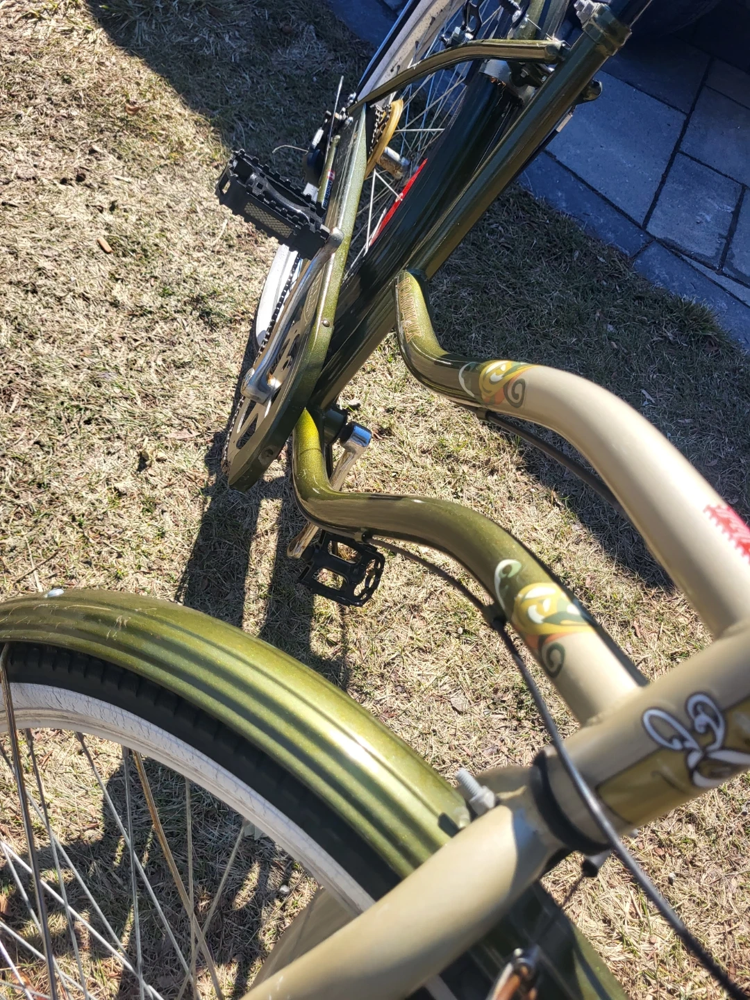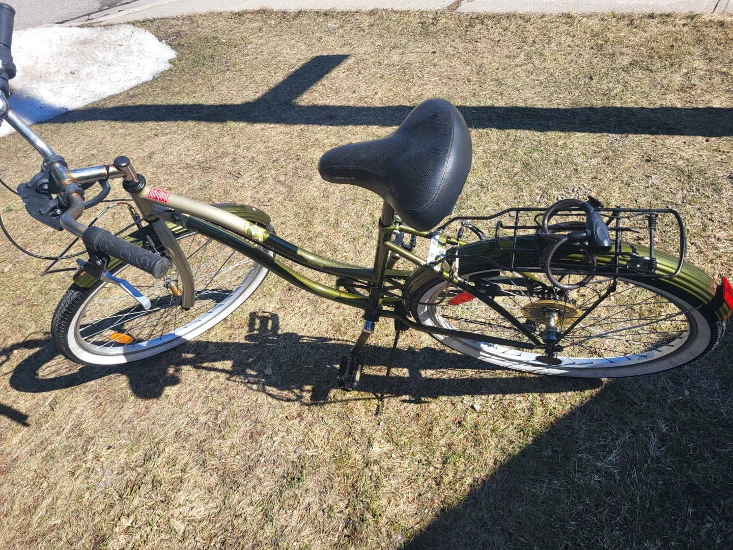 This is a green cruiser bicycle. It has a comfortable seat and a rear rack for carrying items. The handlebars have a bell attached. Great for leisurely rides around town!