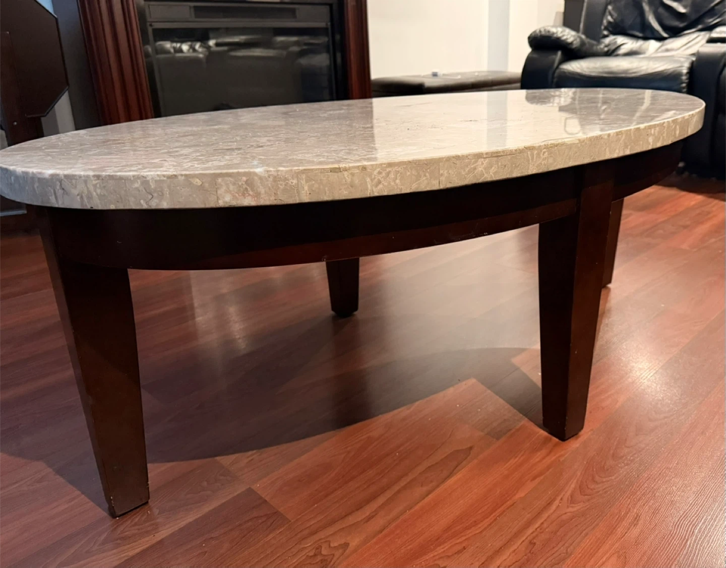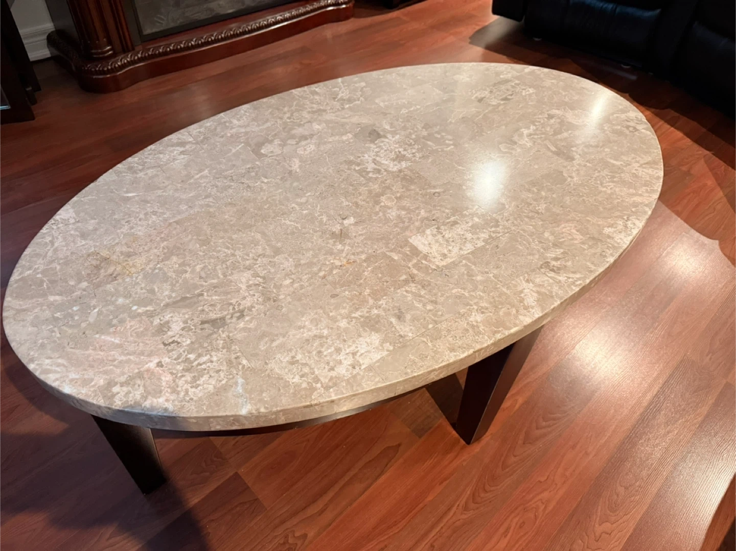 Oval coffee table featuring a marble-patterned top and dark wood legs. Its classic design fits well in various living room settings. The tabletop is made of a durable material with a realistic marble finish.