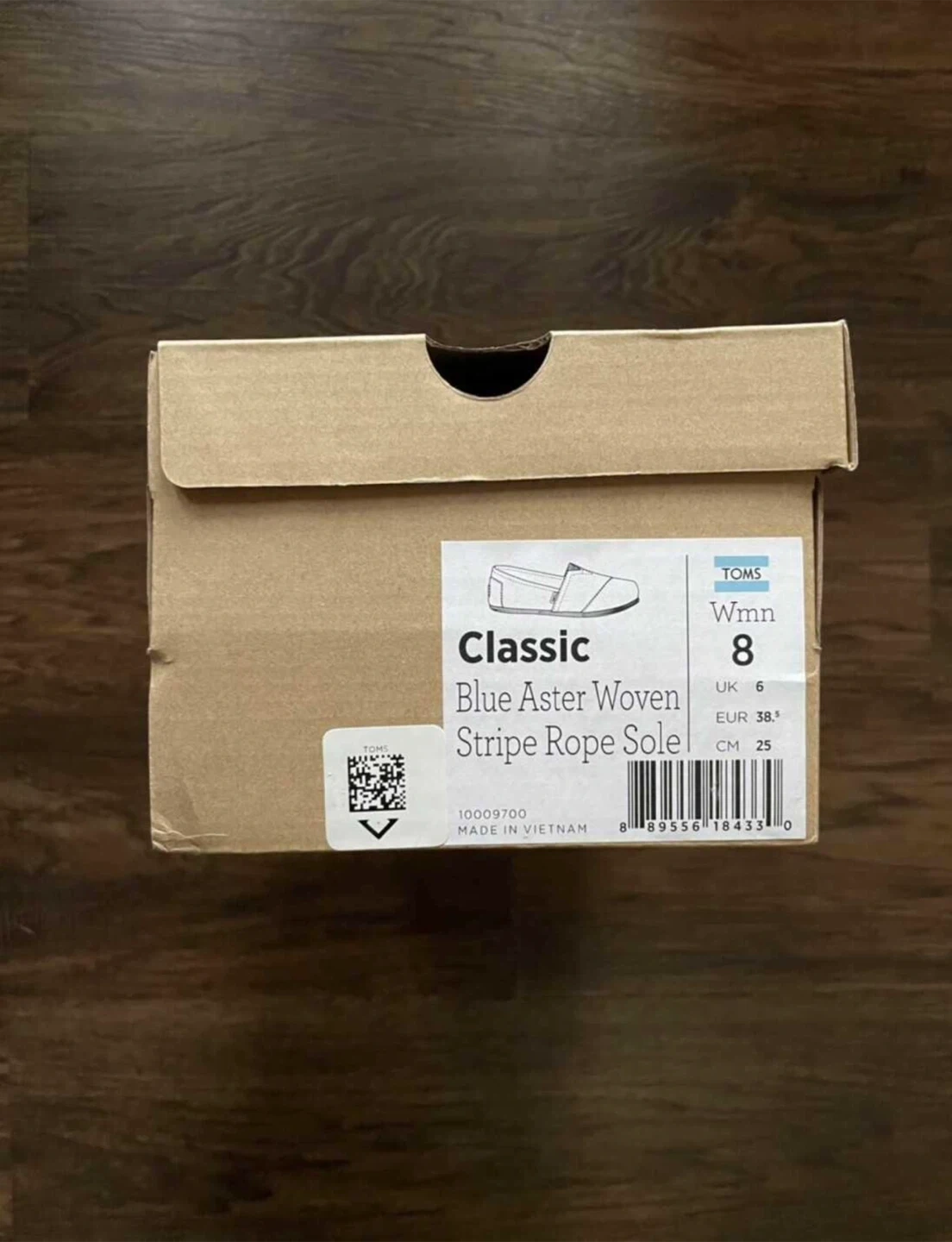 These TOMS Classic slip-on shoes feature a blue aster woven stripe pattern with a rope sole. They're a women's size 8 (UK 6, EUR 38.5, CM 25). Comes with original box.NEVER WORN