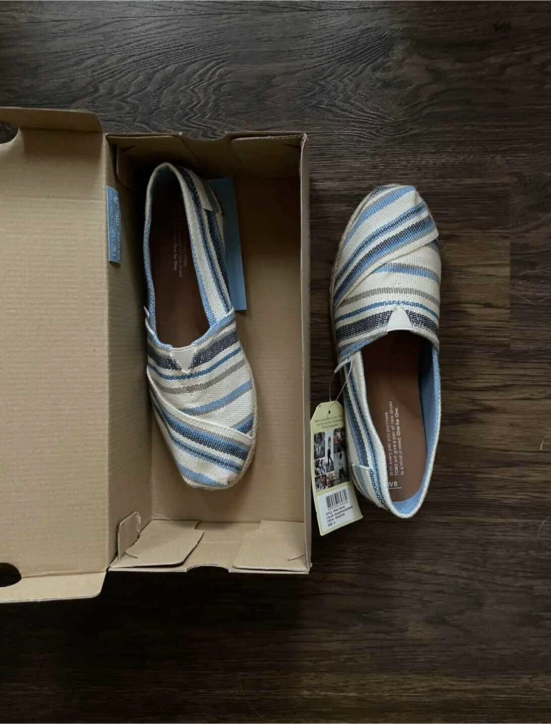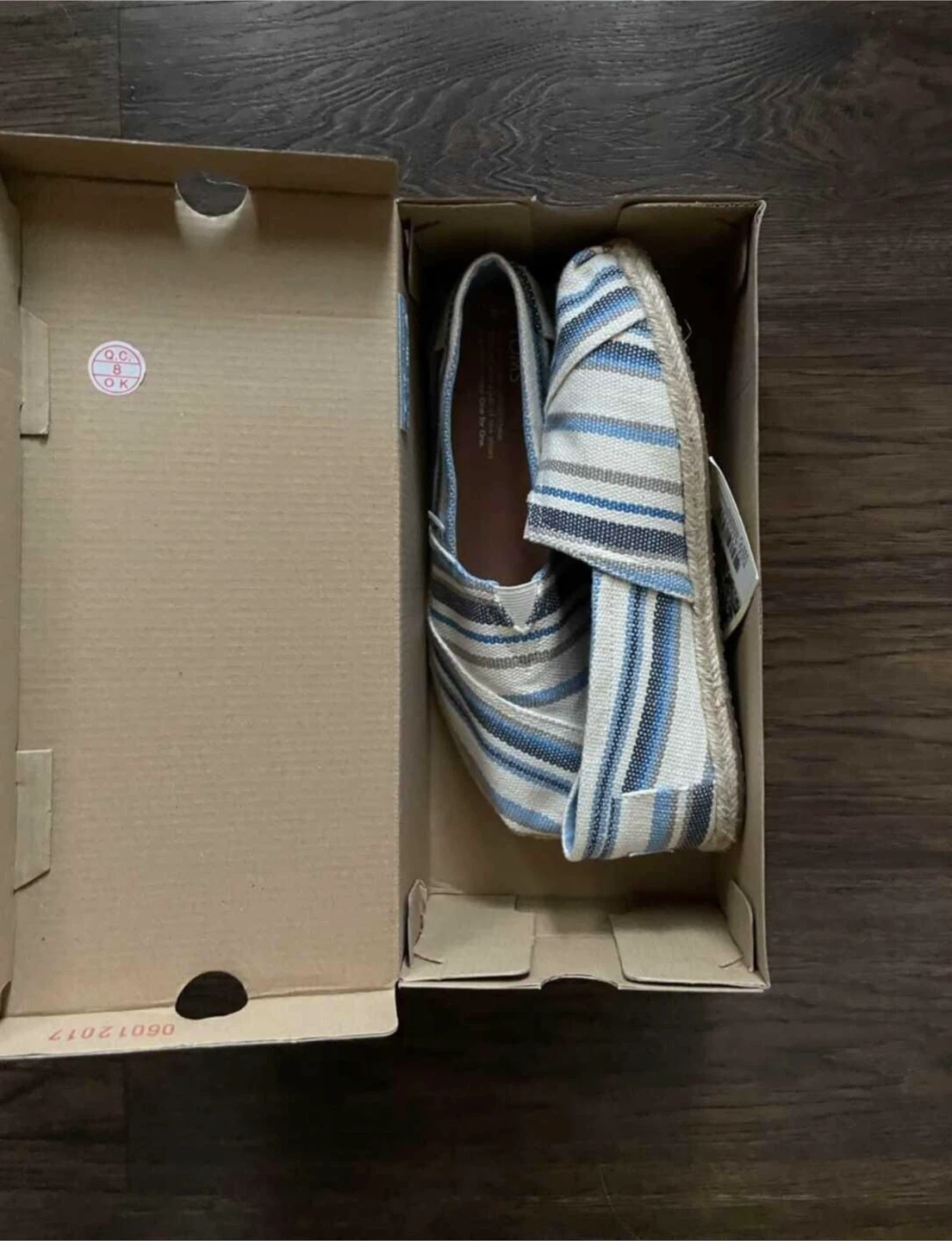 These TOMS Classic slip-on shoes feature a blue aster woven stripe pattern with a rope sole. They're a women's size 8 (UK 6, EUR 38.5, CM 25). Comes with original box.NEVER WORN