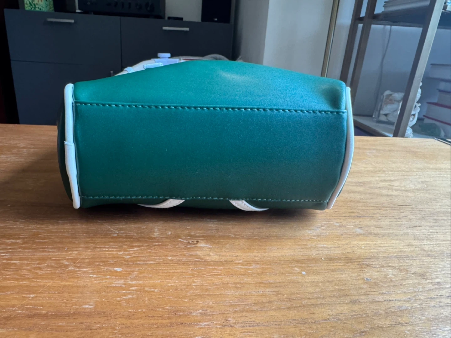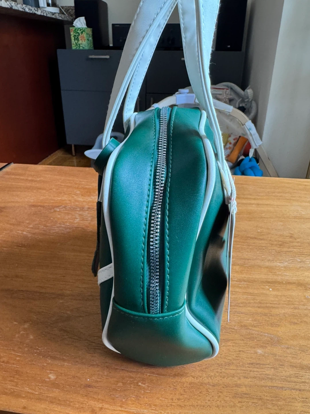 This is a cute Miniso Looney Tunes Bugs Bunny handbag! It's green with white accents and has a Bugs Bunny charm. Perfect for any Looney Tunes fan